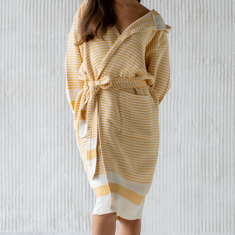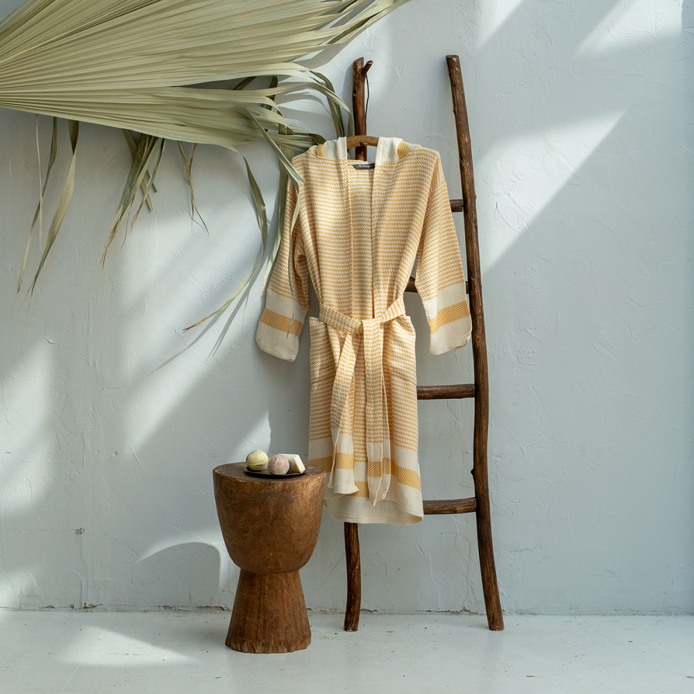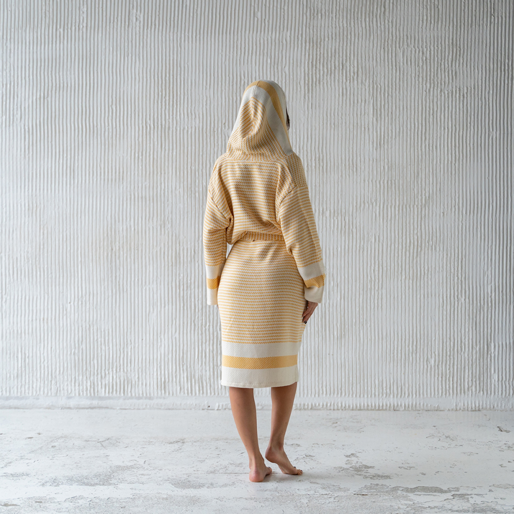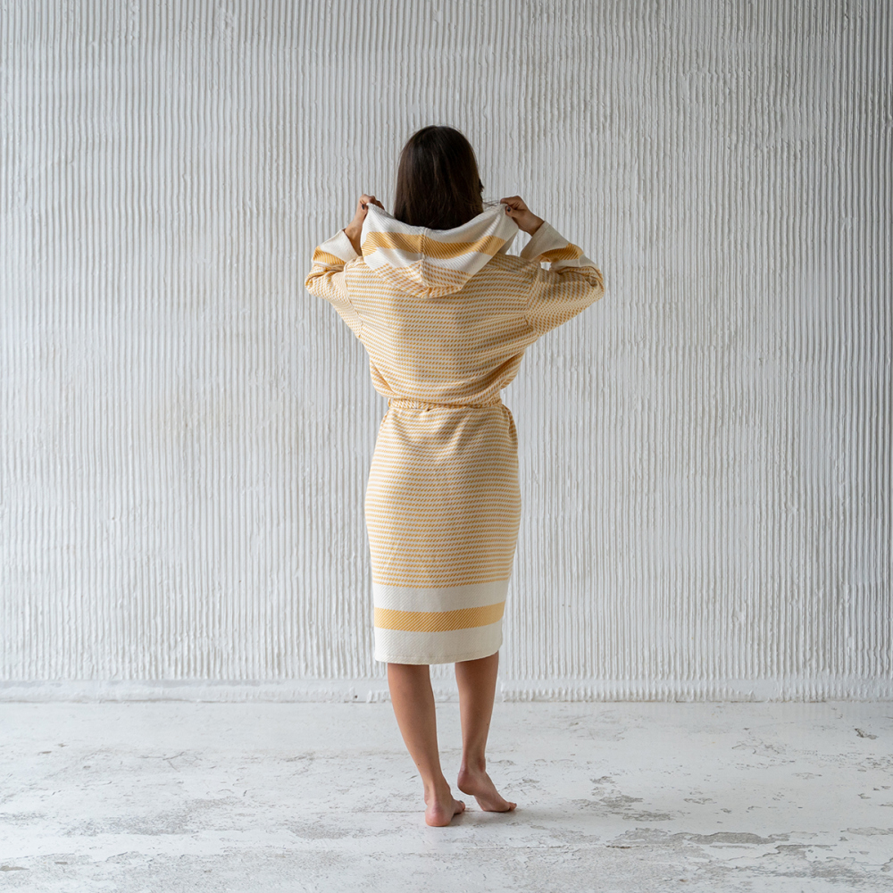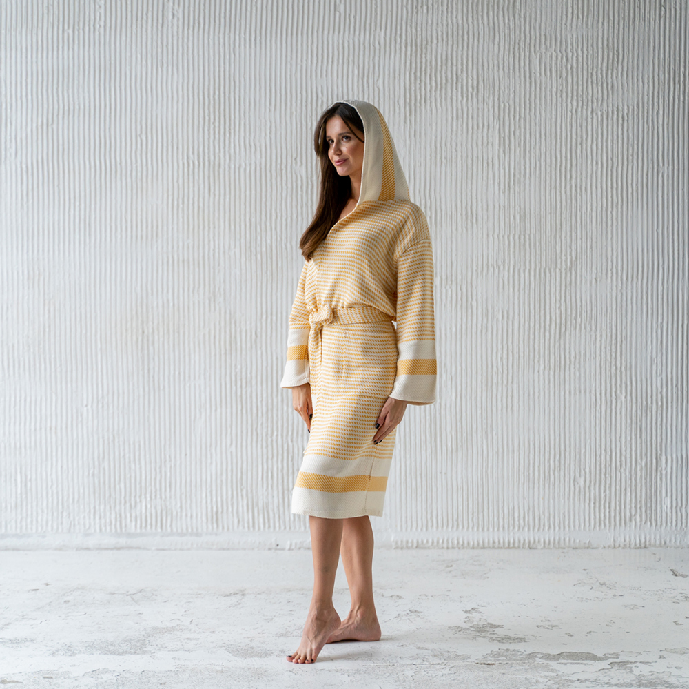 Банный халат с поясом и капюшоном. Плотность ткани: 600 г/м2. Состав: 50% бамбук/50% хлопок. Производство: Россия