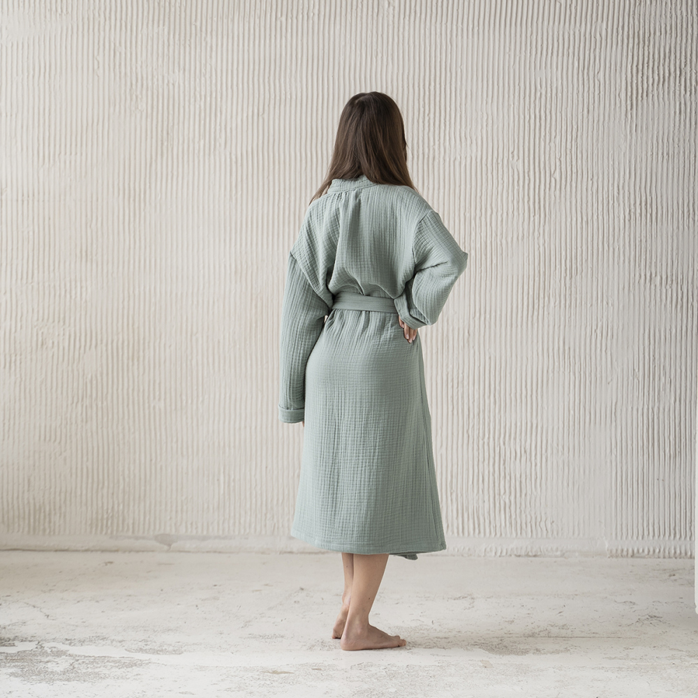 Халат-накидка из четырехслойного муслина с поясом. Идеально подойдет для чувствительной кожи. Муслин хорошо впитывает влагу, быстро сохнет. Материал имеет высокую износостойкость. Состав: 100% хлопок. Производство: Россия