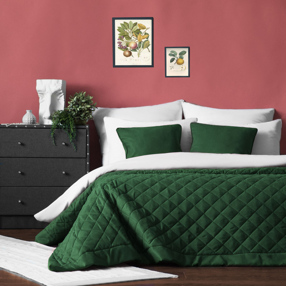 Стеганое покрывало с планками из мягкой бархатистой ткани. В комплект входят декоративные наволочки. Состав - 100% полиэстер.