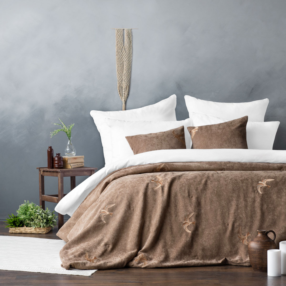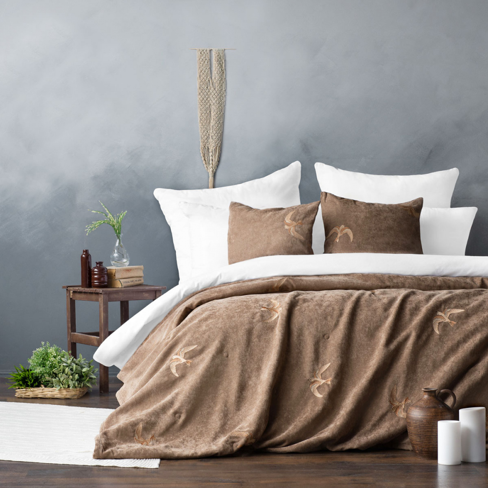 Стеганое покрывало из декоративной ткани "Софт" с вышивкой. В комплект входят декоративные наволочки. Состав - 100% полиэстер.
