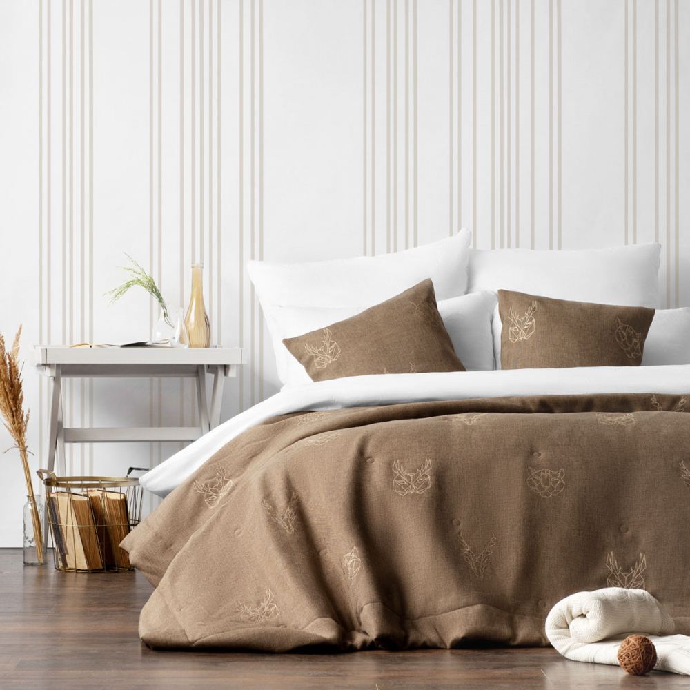 Стеганое покрывало из декоративной ткани "Джерри" с вышивкой. В комплект входят декоративные наволочки. Состав - 100% полиэстер.