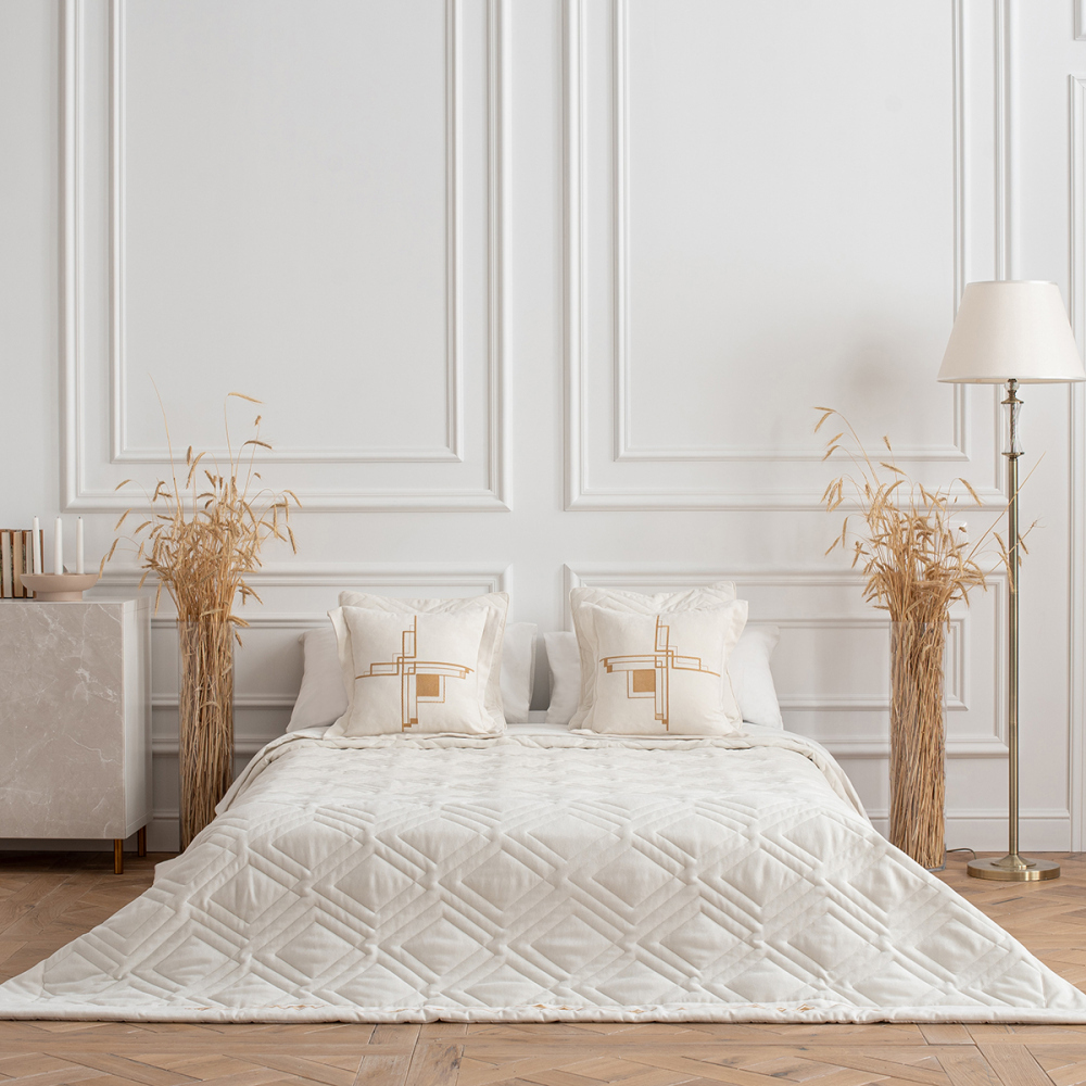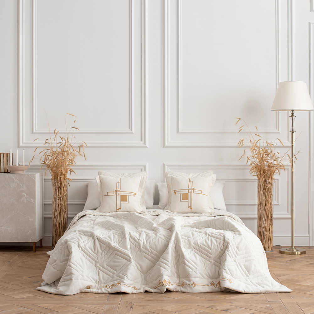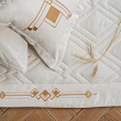 Стеганое покрывало с вышивкой из плотной декоративной ткани "Софт". Состав - 100% полиэстер. В комплект входят декоративные наволочки.