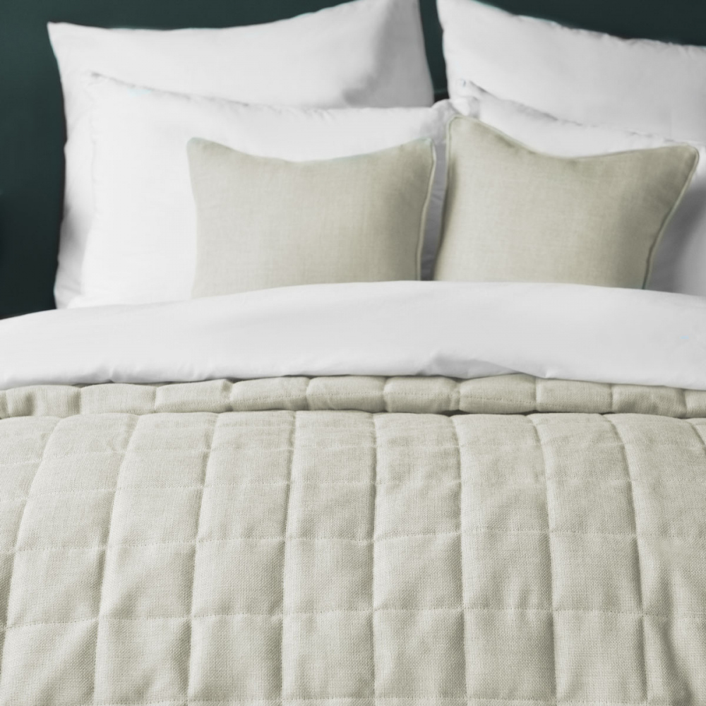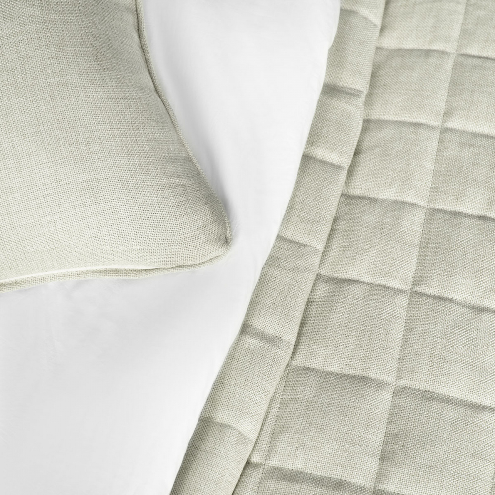 Стеганое покрывало с планками из плотной мягкой ткани, имитирующей натуральную. В комплект входят декоративные наволочки. Состав - 100% полиэстер.