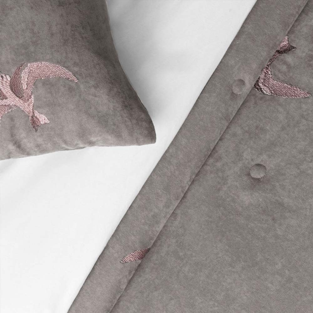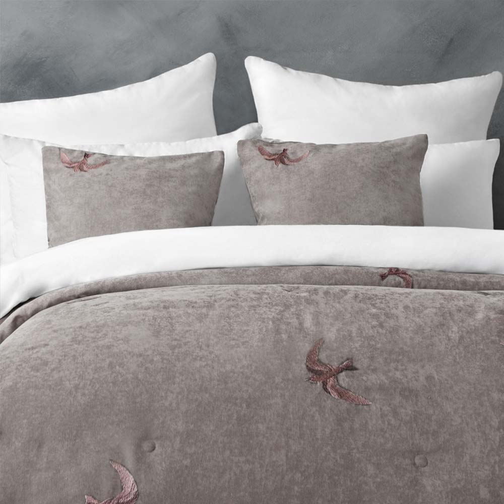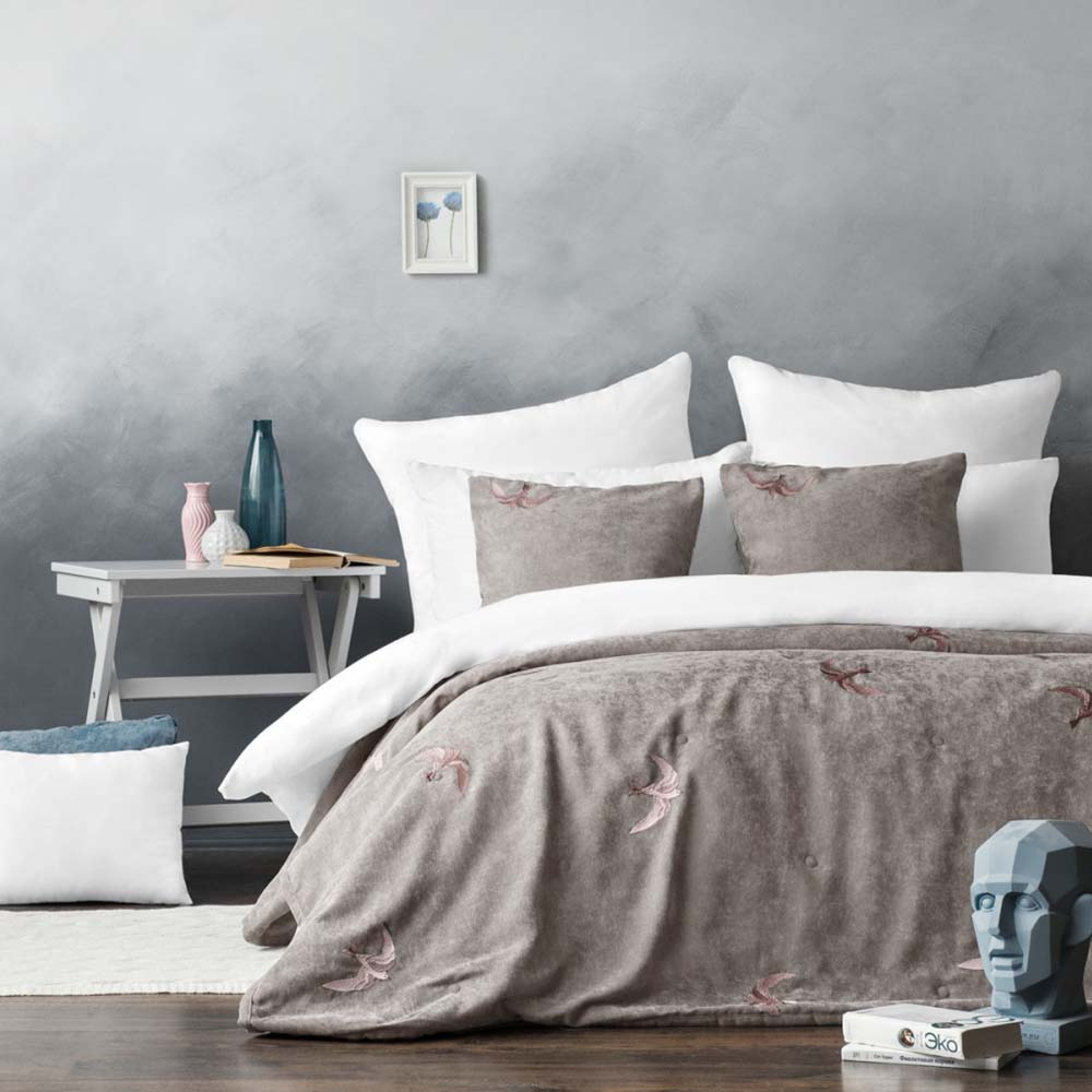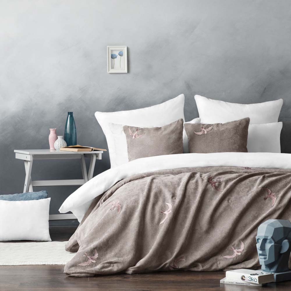 Стеганое покрывало из декоративной ткани "Софт" с вышивкой. В комплект входят декоративные наволочки. Состав - 100% полиэстер.