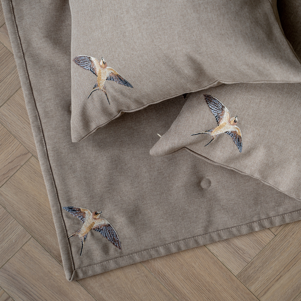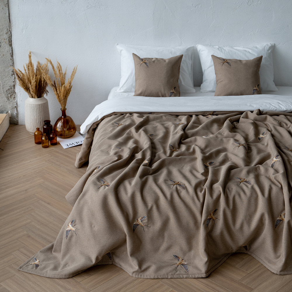 Стеганое покрывало из плотной декоративной ткани "Ибица" с вышивкой. В комплект входят декоративные наволочки. Состав - 100% полиэстер.