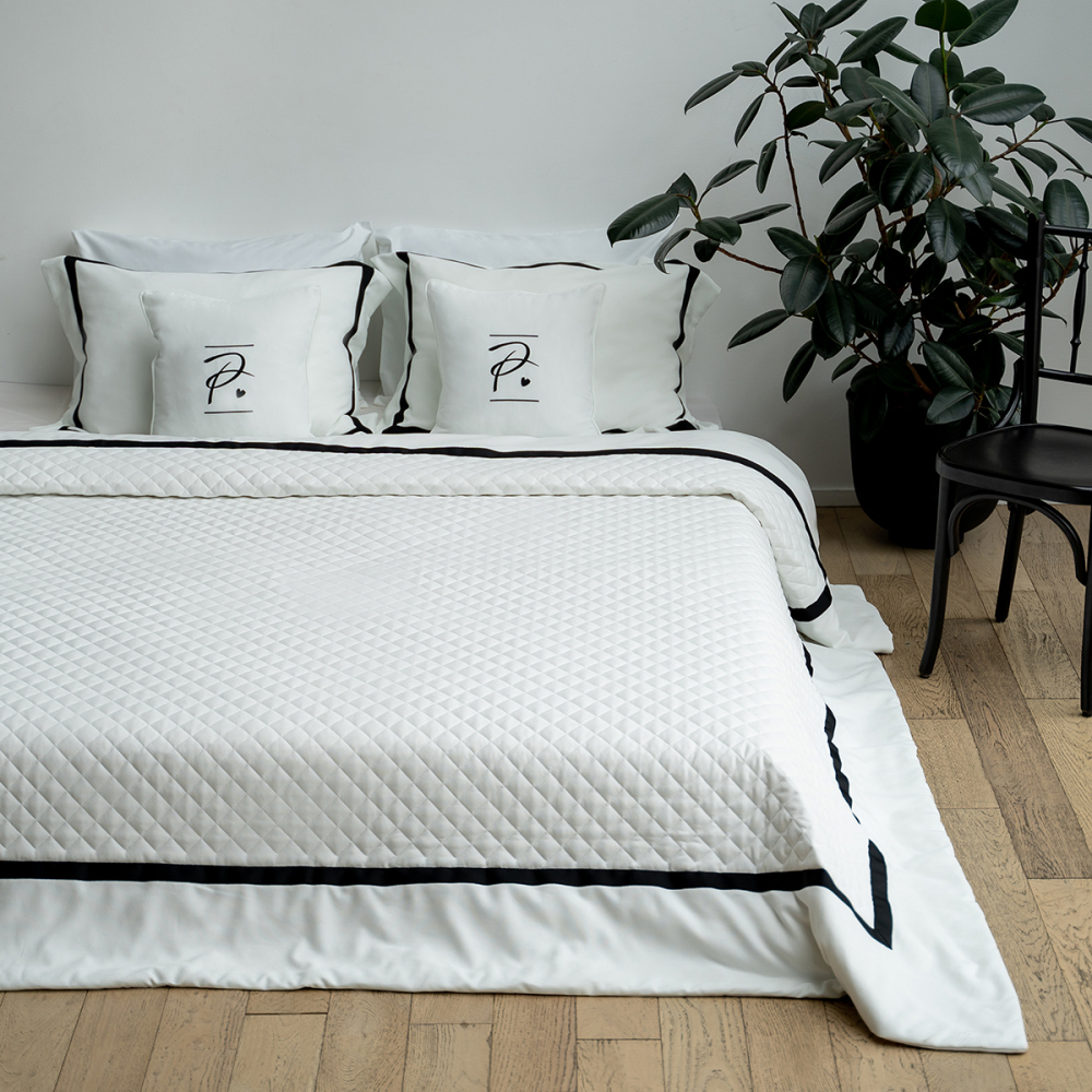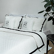 Стеганое покрывало на подкладке с декоративной репсовой лентой из ткани "Софт". В комплект входят 2 декоративные наволочки с именной вышивкой и 2 декоративные наволочки с репсовой лентой. Состав - 100% полиэстер.