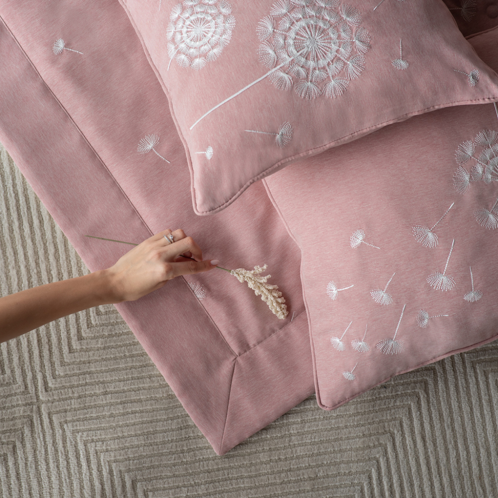 Стеганое покрывало на подкладке с декоративной вышивкой. В комлпект входят декоративные наволочки. Состав - 100% полиэстер.