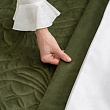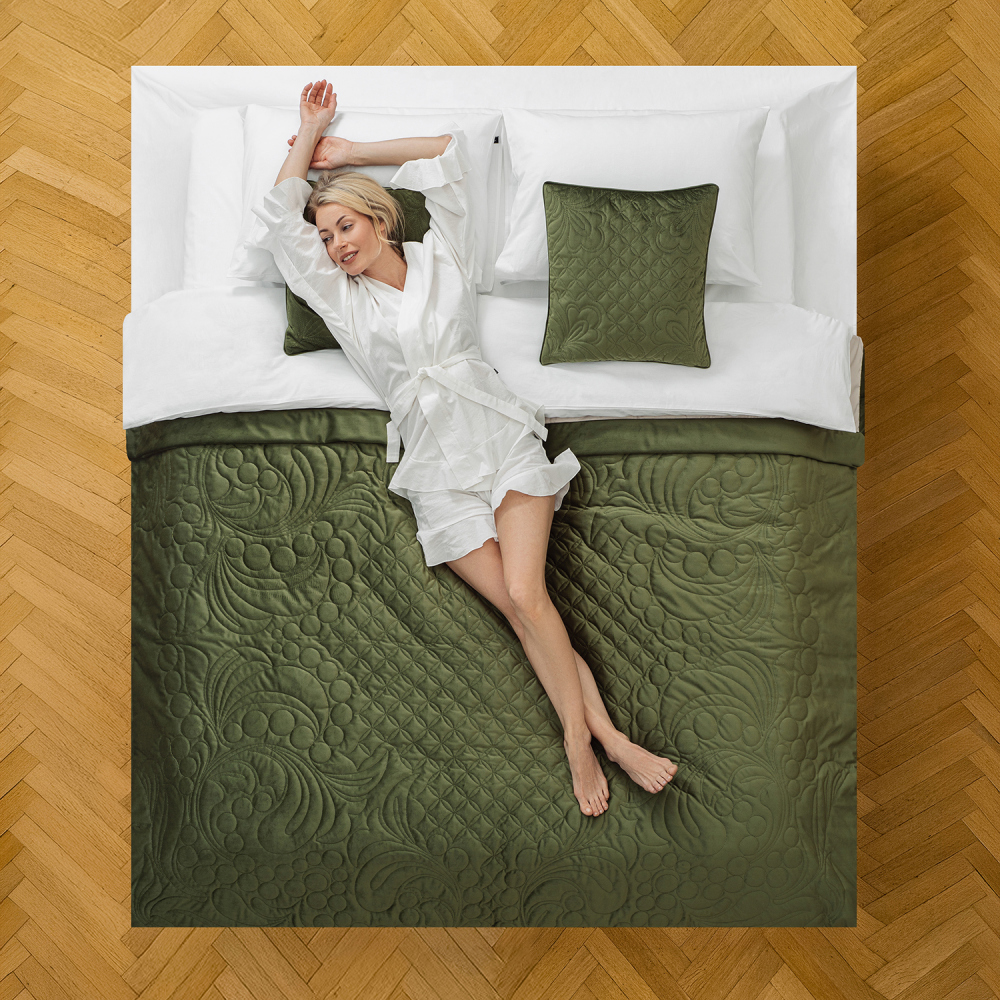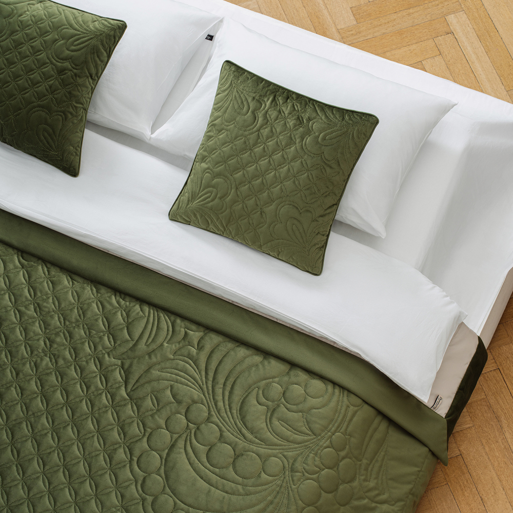 Стеганое покрывало из плотной декоративной ткани бархат. Изысканная однотонная основа украшена авторской стежкой, вдохновленной знаменитым промыслом хохлома. В комплект входят декоративные наволочки. Состав - 100% полиэстер.