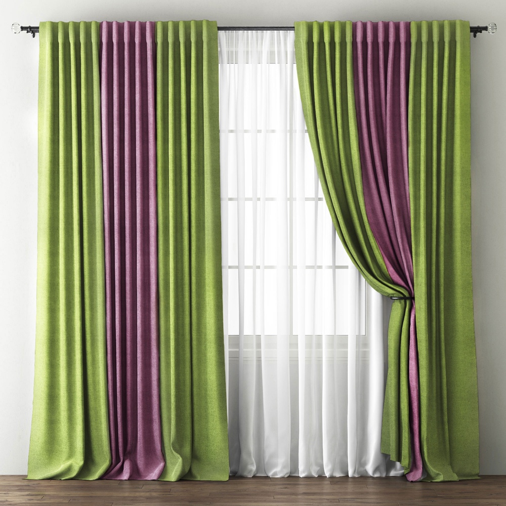 Прямые плотные комбинированные портьеры на универсальной шторной ленте из ткани "Ибица". В комплект входит гардинное полотно. Модель дополнена фигурными подхватами. Состав - 100% полиэстер.