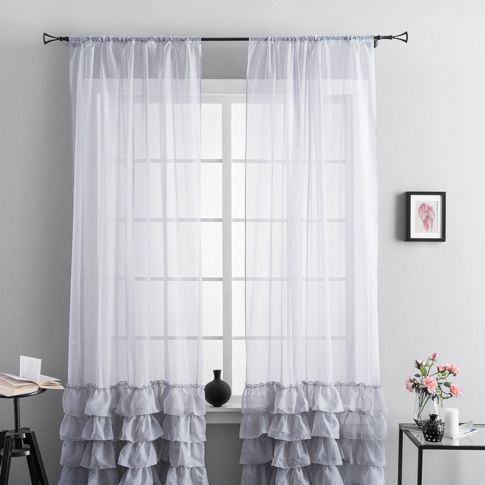 Комплект легких штор "Ноа" выполнен из однотонной матовой вуали. Низ портьер украшен декоративными рюшами.