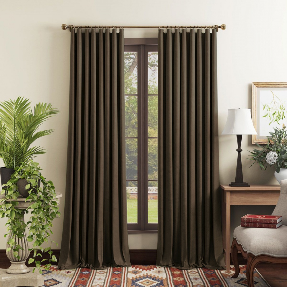 Прямые однотонные портьеры на универстальной шторной ленте из мягкой бархатной ткани "Репаблик". Состав - 100% полиэстер.