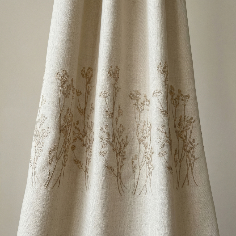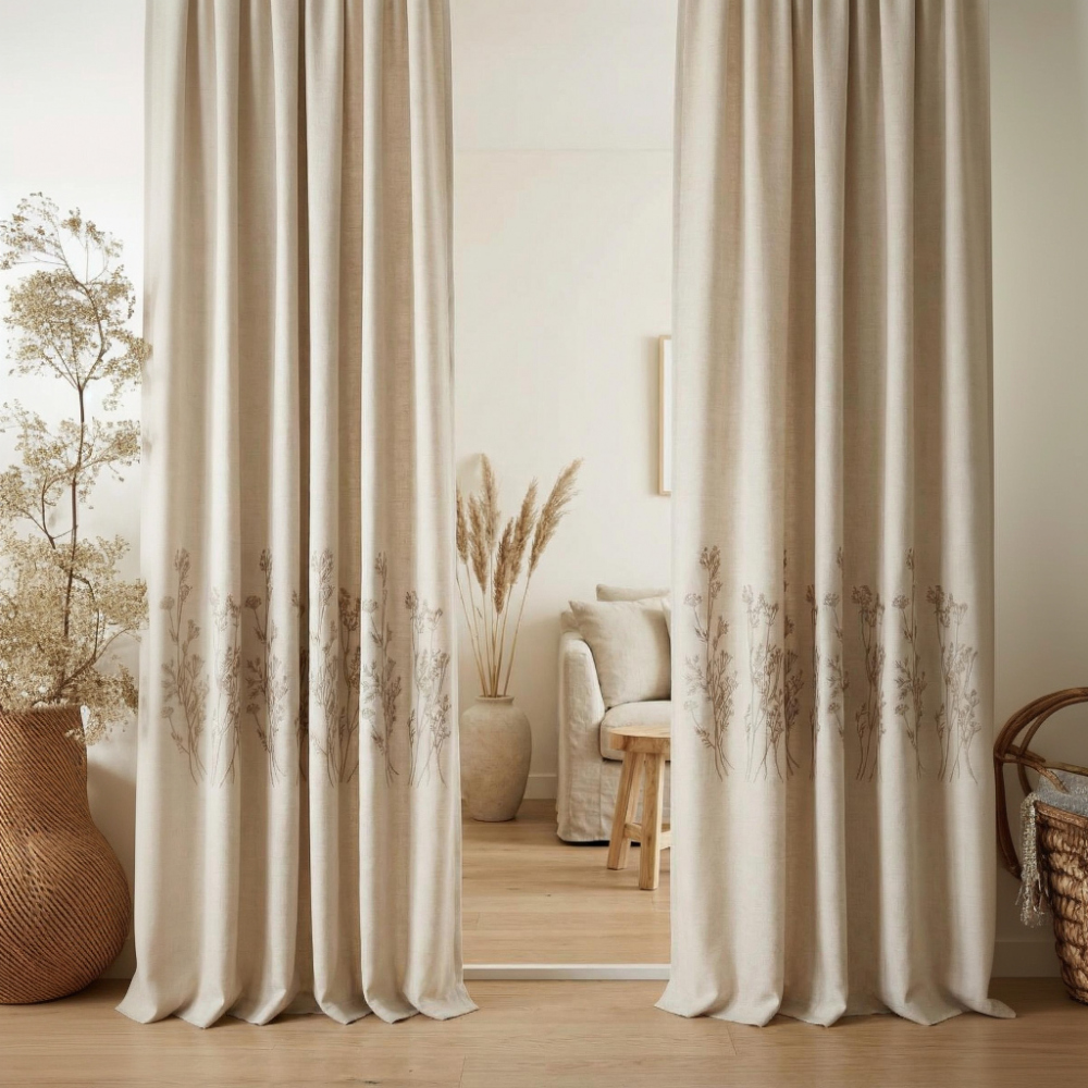 Прямые портьеры на шторной ленте из декоративной ткани "Бохо" с вышивкой. Состав - 100% полиэстер. Сделано в России.