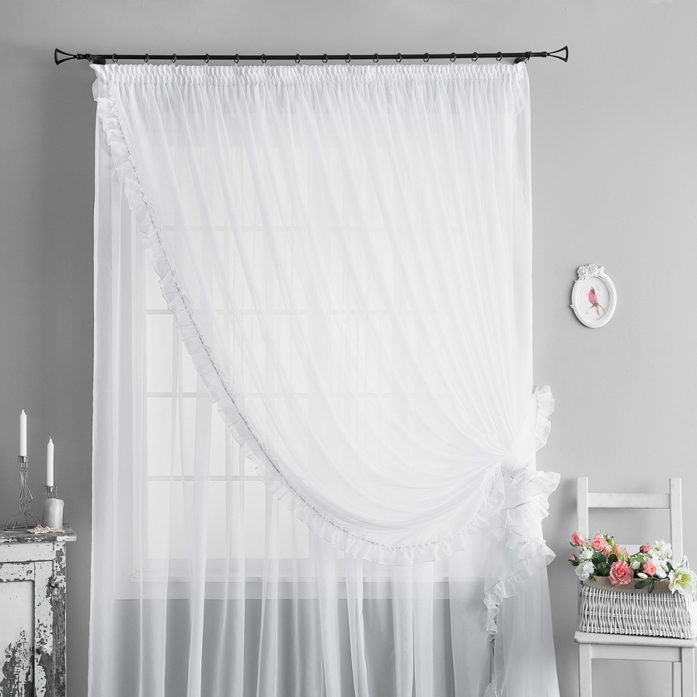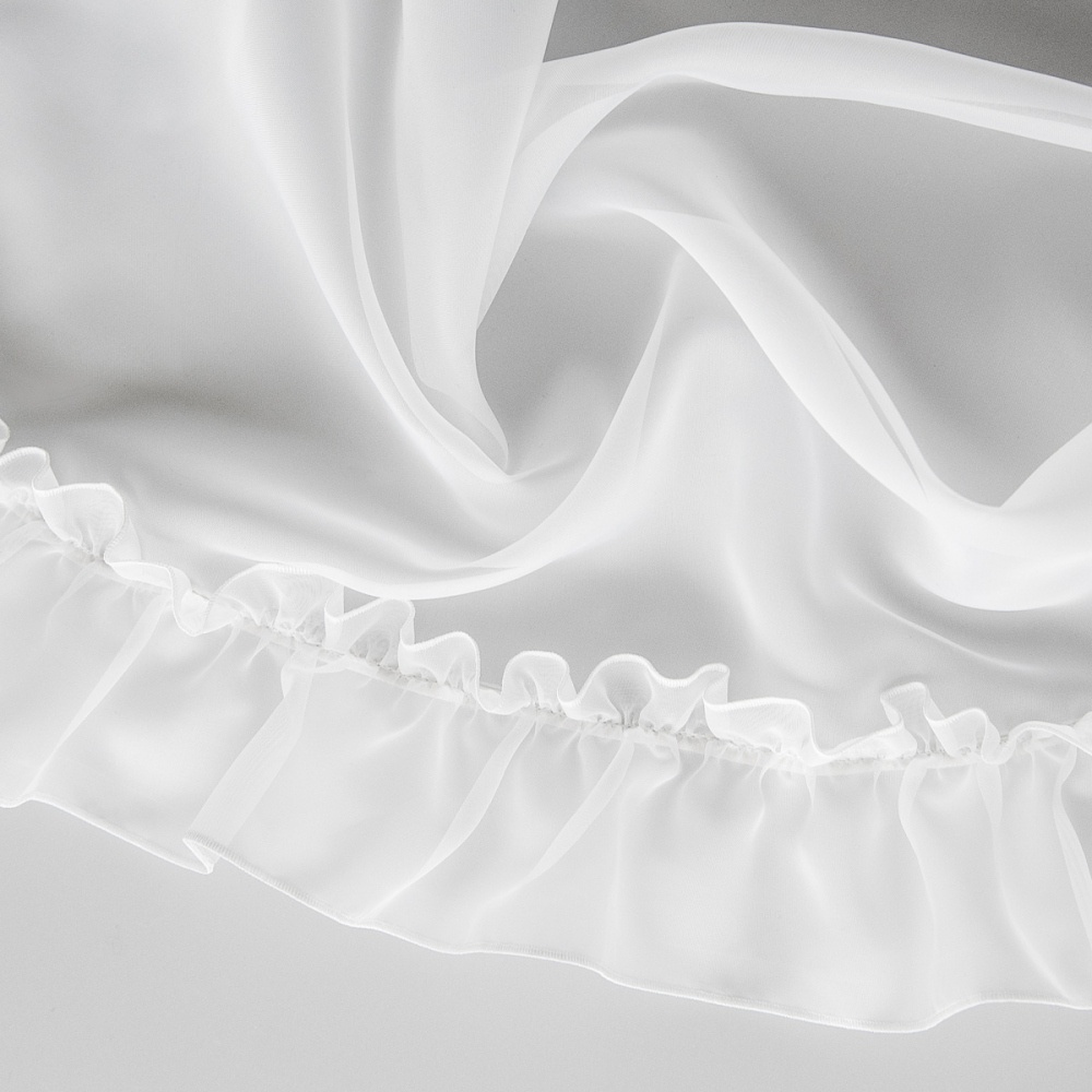 По верхней части предусмотрена прозрачная шторная лента – универсальный и наиболее популярный вид крепления для удобной навески портьеры. В комплект входят два декоративных подхвата из вуали с рюшами, что обеспечивает вариативность фиксации штор, позволяя частично или полностью закрывать оконный проем по своему вкусу.