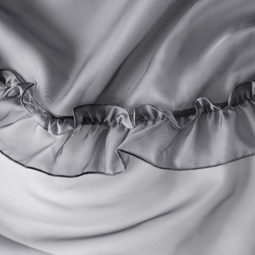 По верхней части предусмотрена прозрачная шторная лента – универсальный и наиболее популярный вид крепления для удобной навески портьеры. В комплект входят два декоративных подхвата из вуали с рюшами, что обеспечивает вариативность фиксации штор, позволяя частично или полностью закрывать оконный проем по своему вкусу.