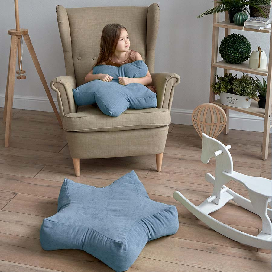 Плотная набивка интерьерной подушки делает её универсальной и позволяет использовать как декор для кровати или на диван и как сидушку на пол или стул. Благодаря мягкой бархатистой текстуре ткани подушка дополняет детские и игровые комнаты. Мальчики и девочки лежат, сидят и активно используют звездочки как игрушки.
