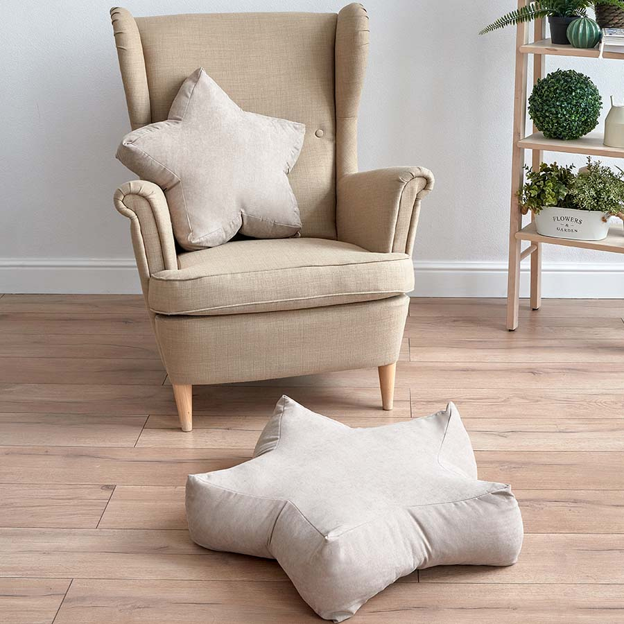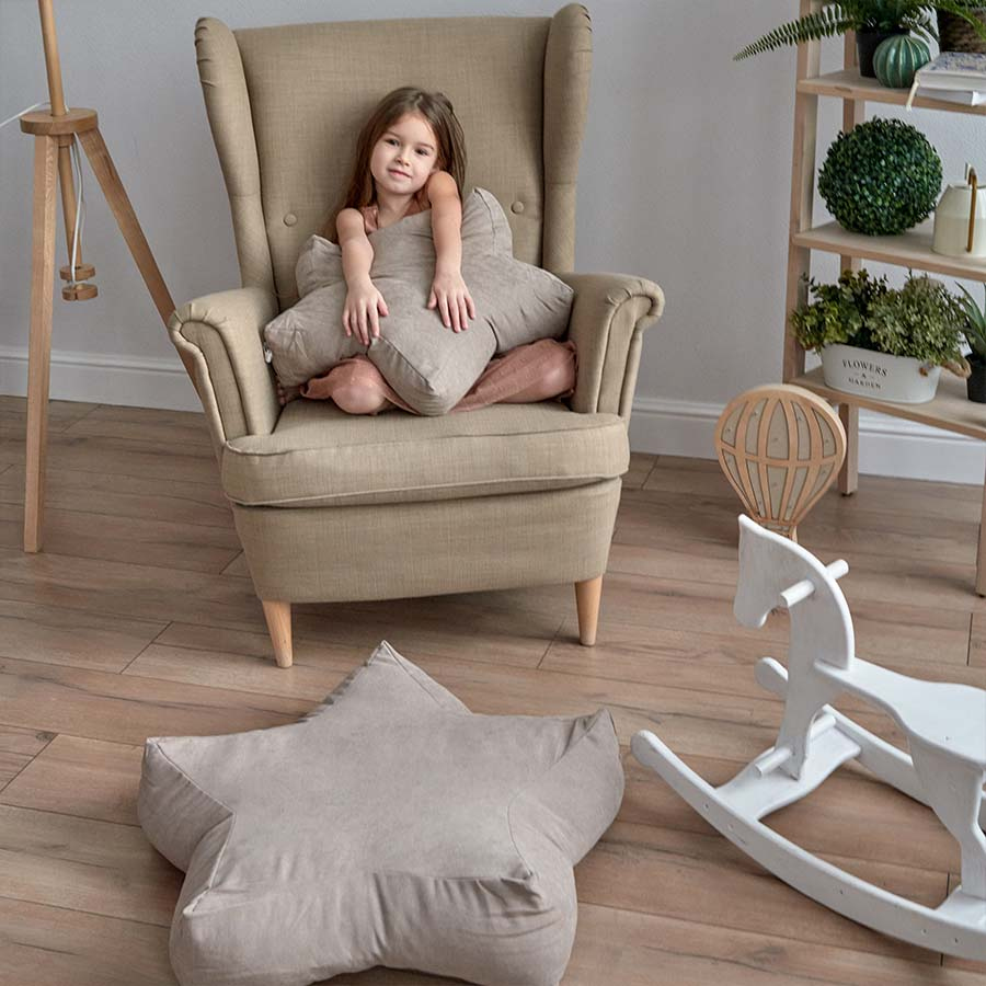 Плотная набивка интерьерной подушки делает её универсальной и позволяет использовать как декор для кровати или на диван и как сидушку на пол или стул. Благодаря мягкой бархатистой текстуре ткани подушка дополняет детские и игровые комнаты. Мальчики и девочки лежат, сидят и активно используют звездочки как игрушки.