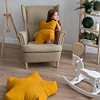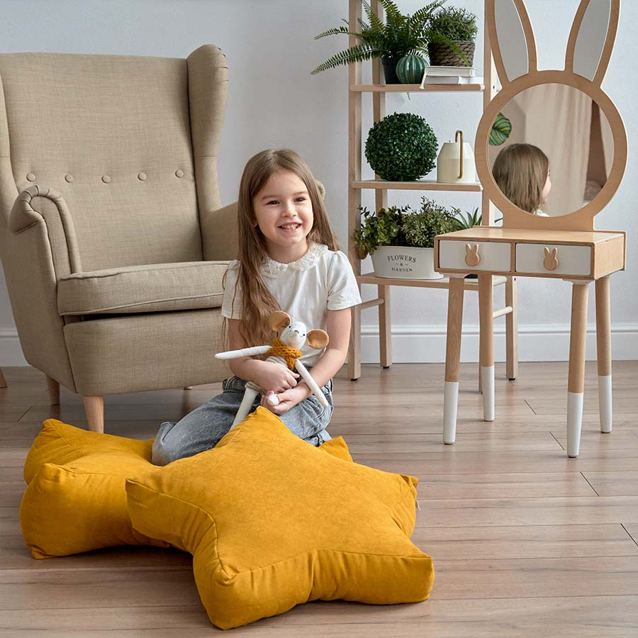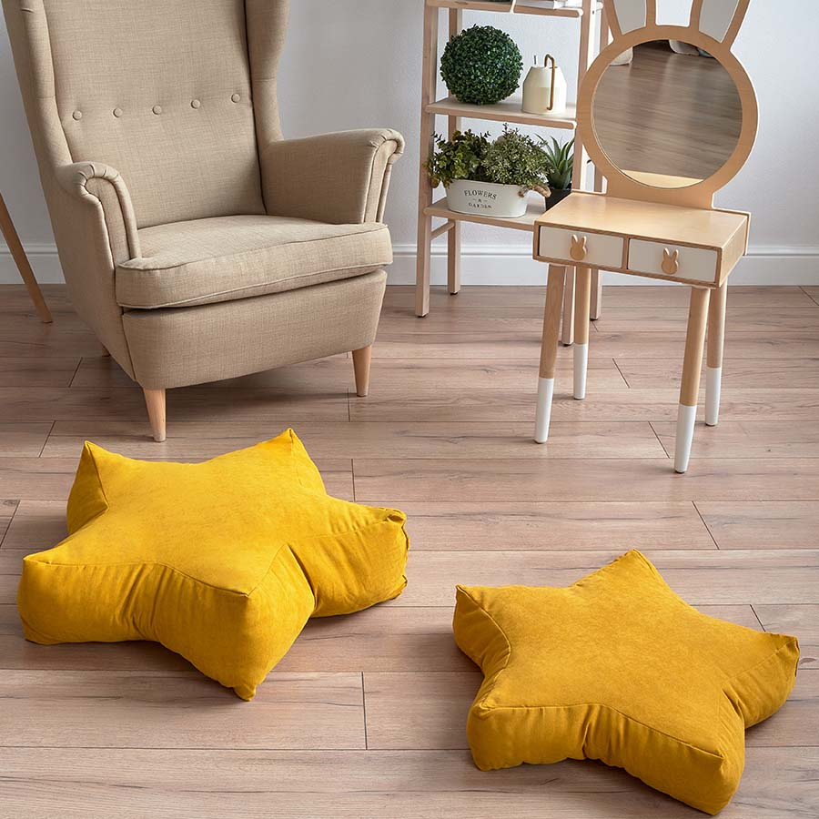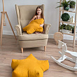 Плотная набивка интерьерной подушки делает её универсальной и позволяет использовать как декор для кровати или на диван и как сидушку на пол или стул. Благодаря мягкой бархатистой текстуре ткани подушка дополняет детские и игровые комнаты. Мальчики и девочки лежат, сидят и активно используют звездочки как игрушки.
