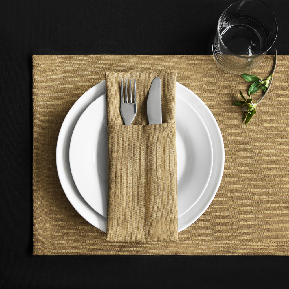 Комплект текстильных кувертов на два прибора из фактурной декоративной ткани "под рогожку". Состав ткани - 100% Полиэстер. Плотность ткани 325 г/м2.