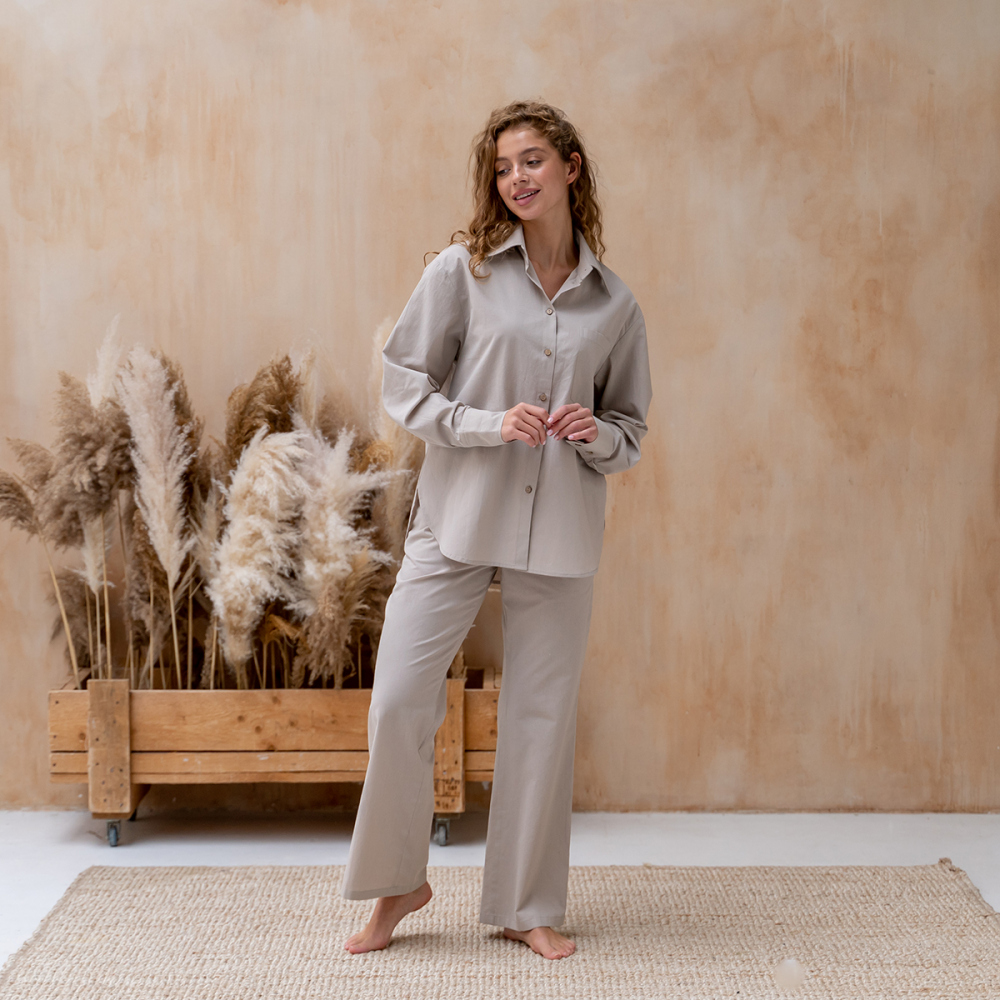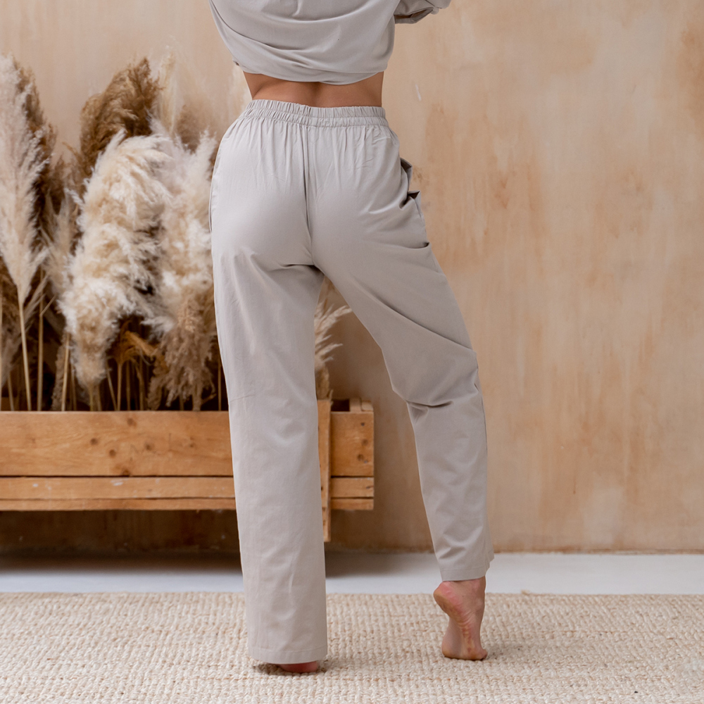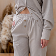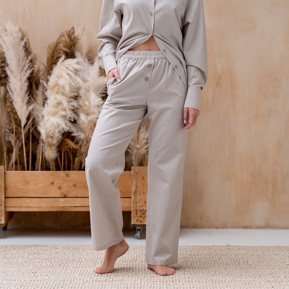 Брюки из вареного хлопка прямого кроя на резинке, декорированные контрастными пуговицами. Состав - 100% Хлопок. Параметры модели - 172, 87/62/92. На модели - размер S/M. Сделано в России.