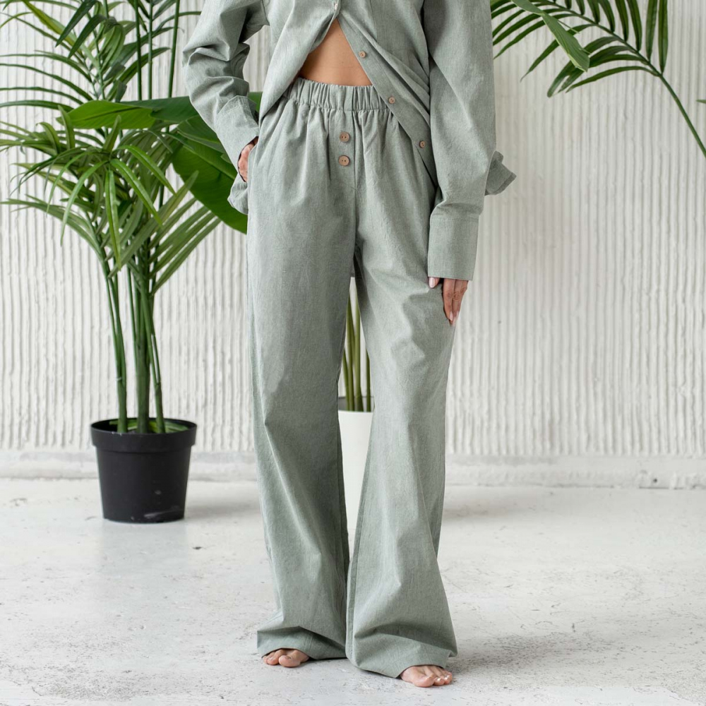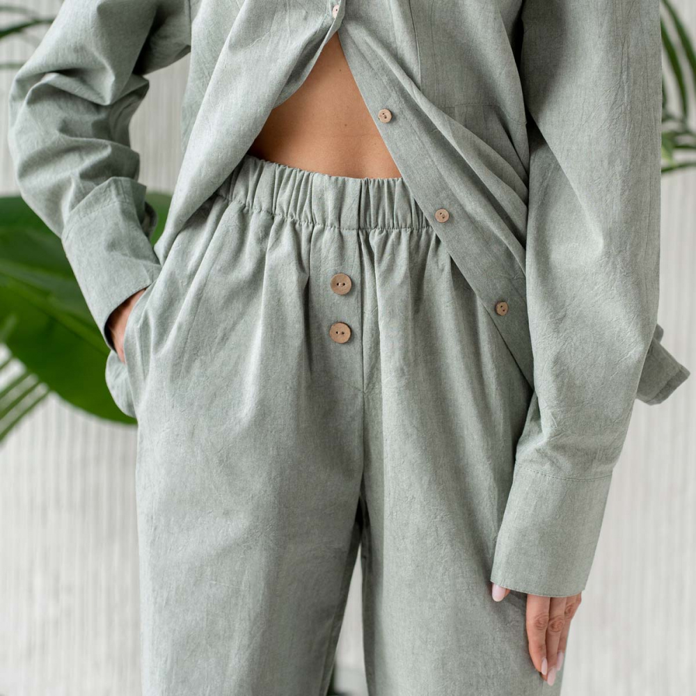Брюки из вареного хлопка прямого кроя на резинке, декорированные контрастными пуговицами. Состав - 100% Хлопок. Параметры модели - 172, 87/62/92. На модели - размер S/M. Сделано в России.
