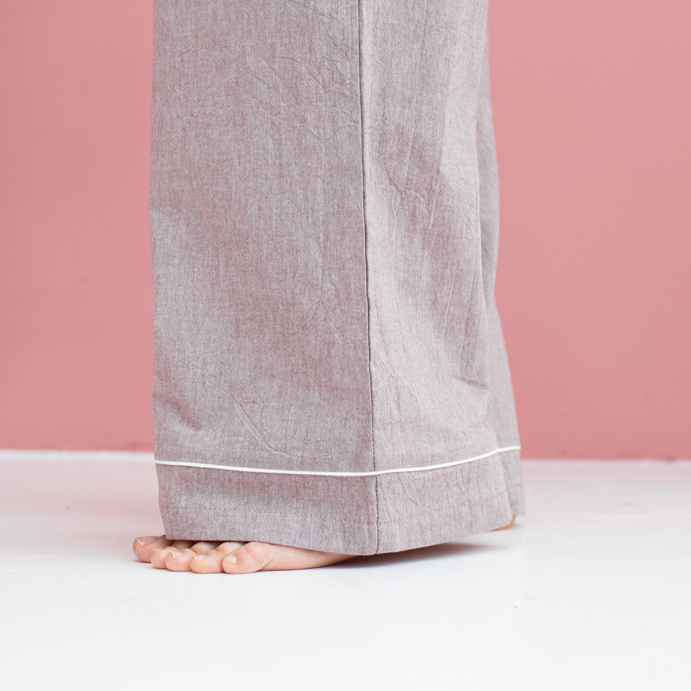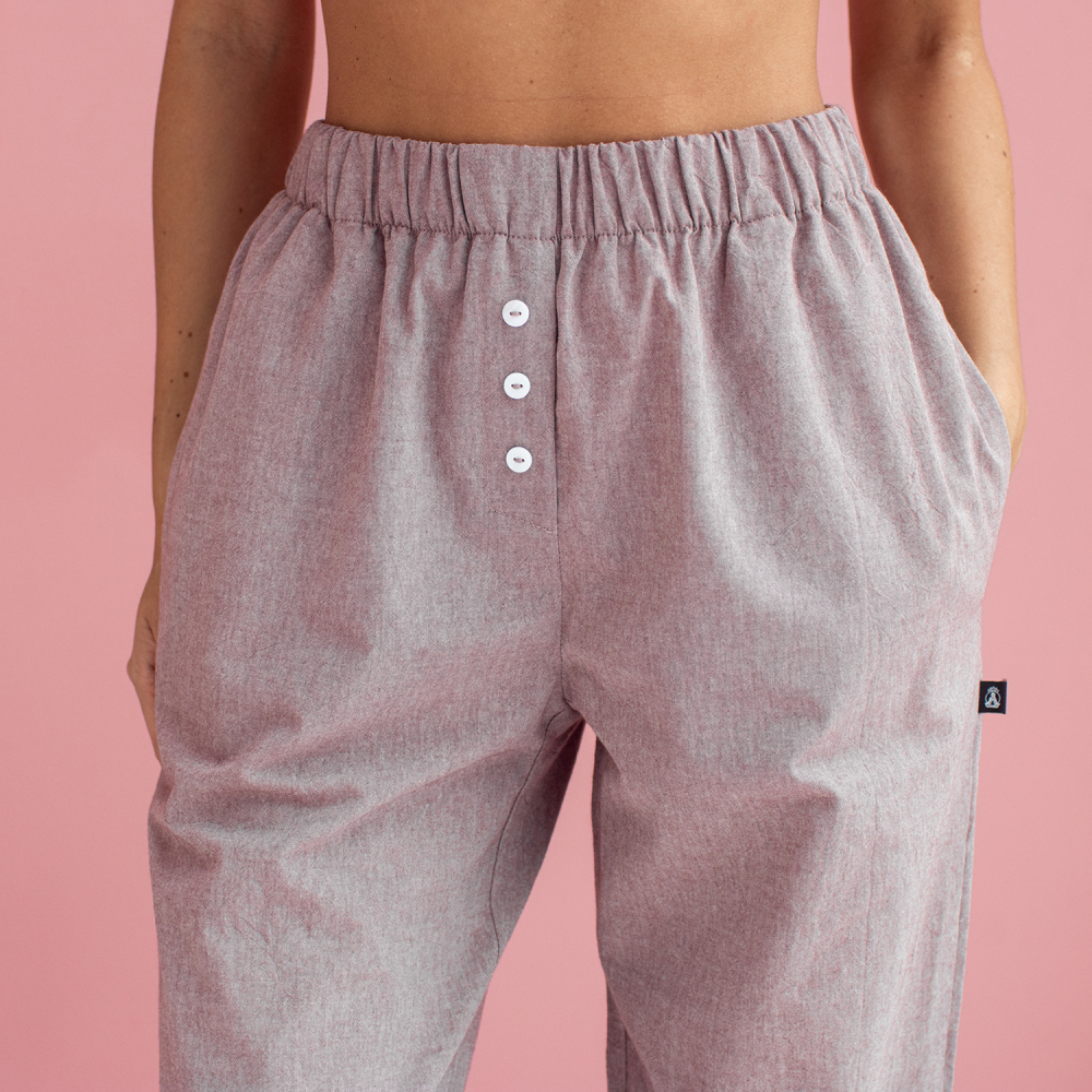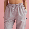 Брюки из вареного хлопка прямого кроя на резинке, декорированные контрастными пуговицами и кантом. Состав - 100% Хлопок. Параметры модели - 172, 87/62/92. На модели - размер S/M. Сделано в России.