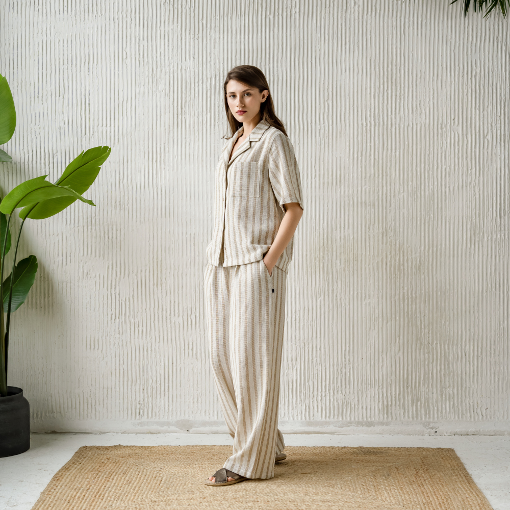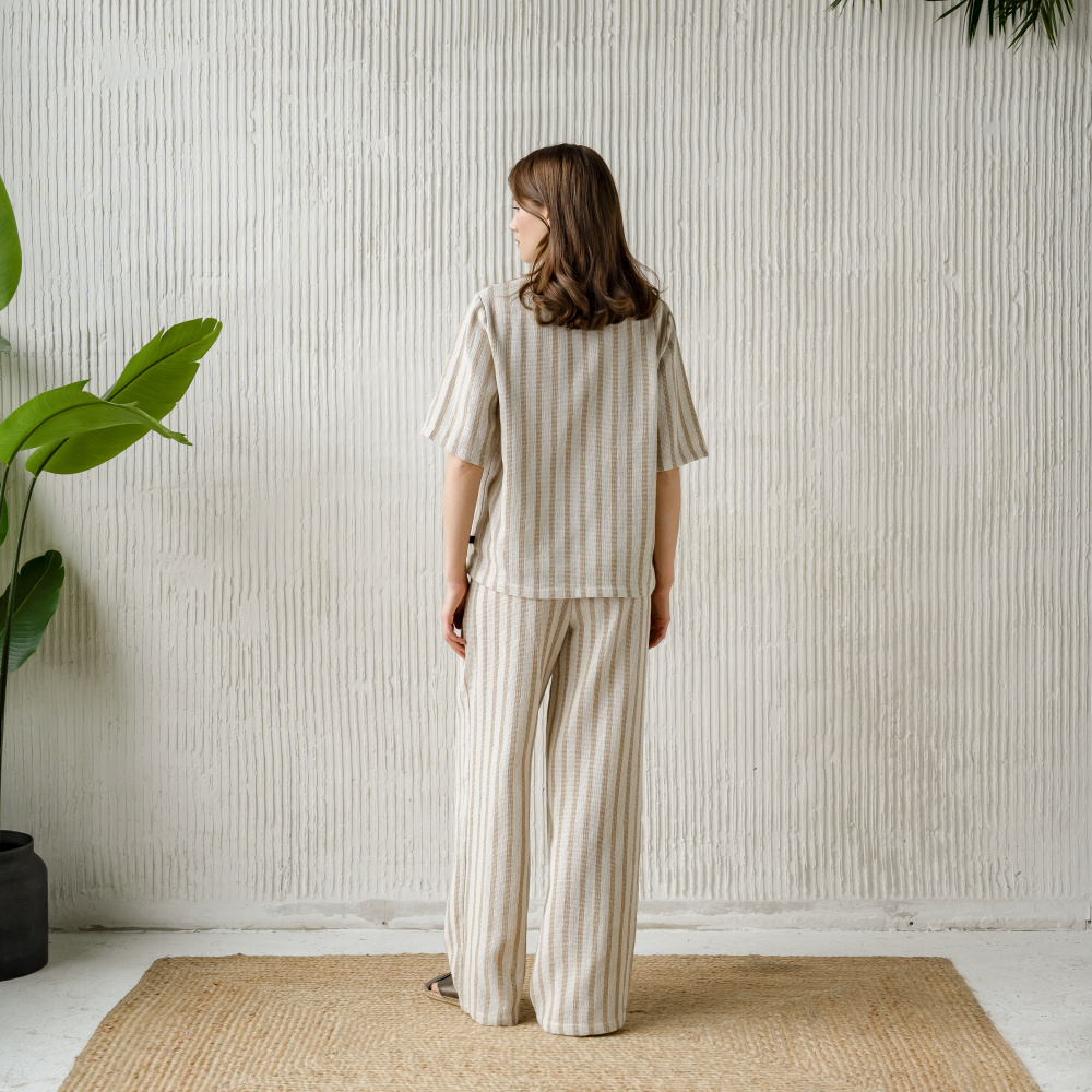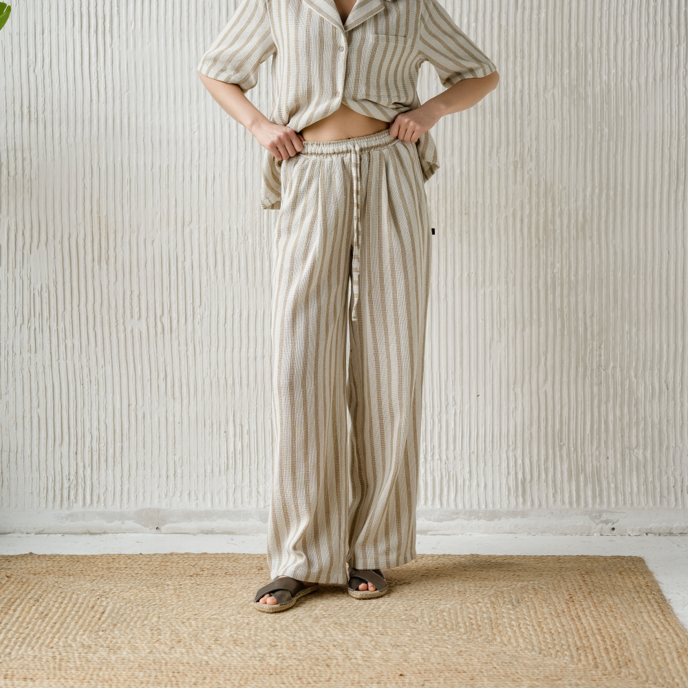 Брюки прямого кроя на завязках из фактурного хлопка. Состав 70% хлопок/30% ПЭ. Сделано в России.