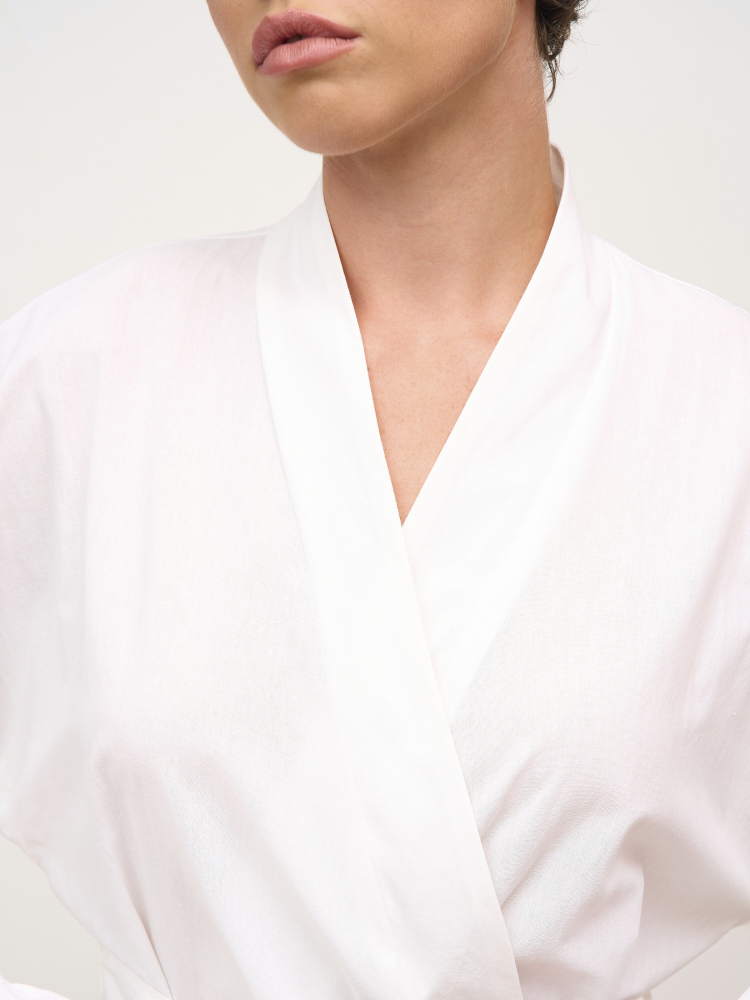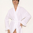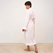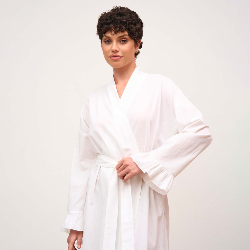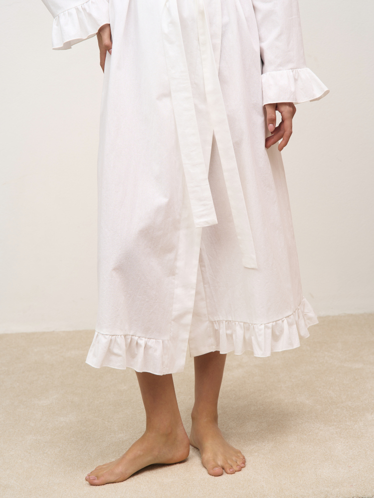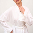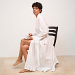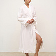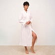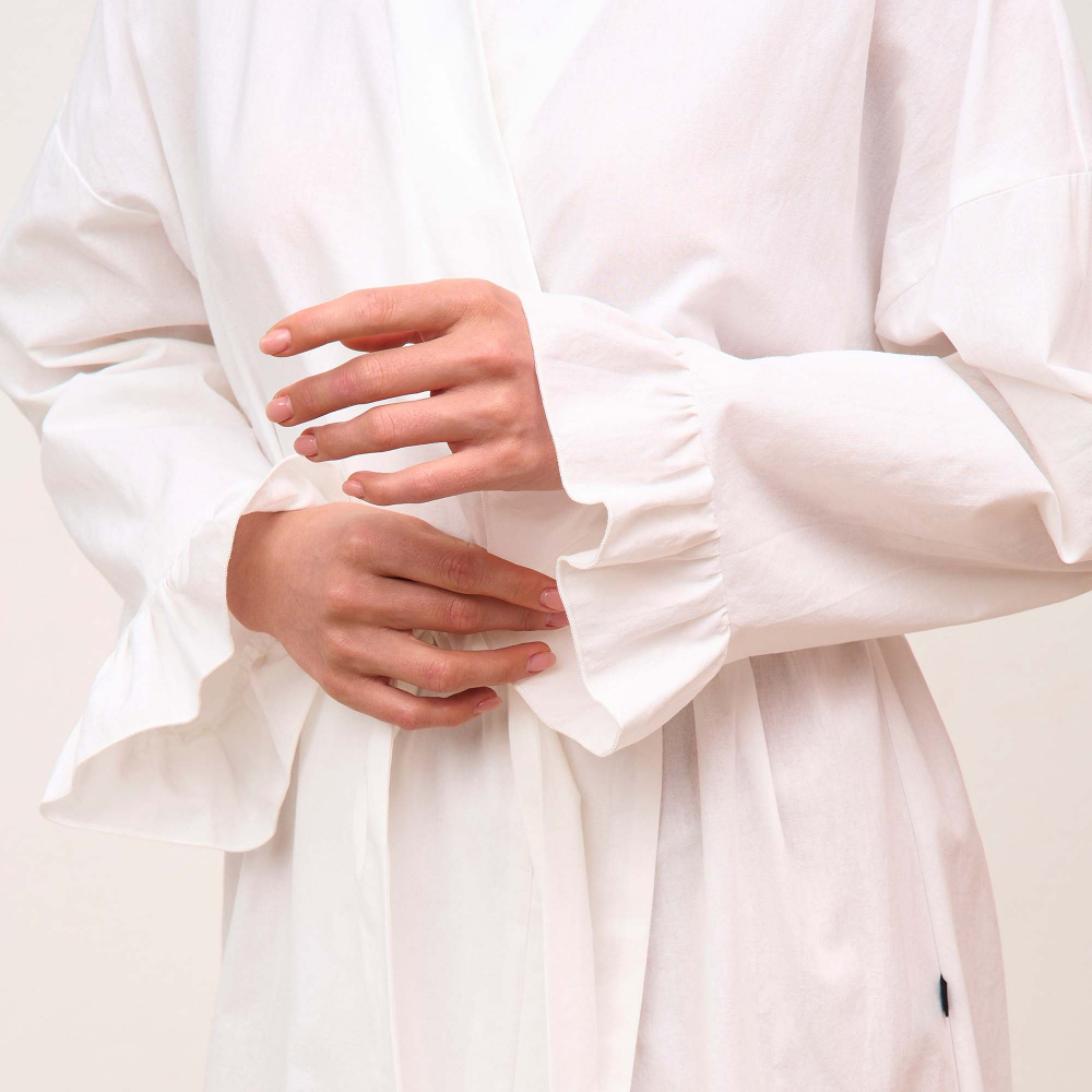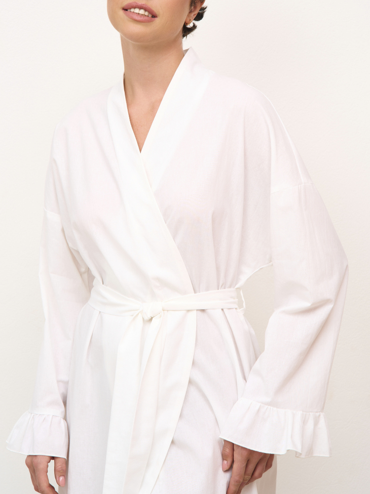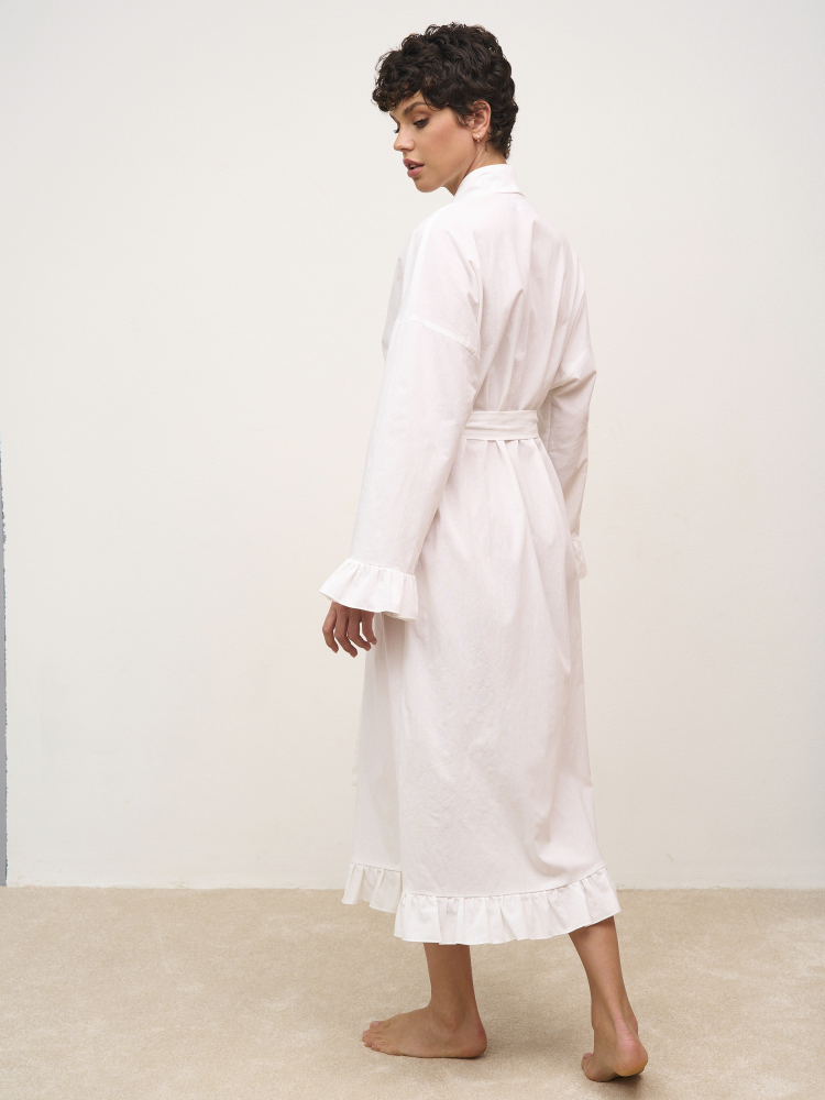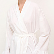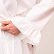 Халат-кимоно из вареного хлопка на запахе и длиной "макси", декорированный рюшами. В комплект входит пояс. Состав - 100% хлопок. Сделано в России.