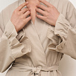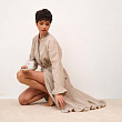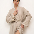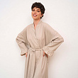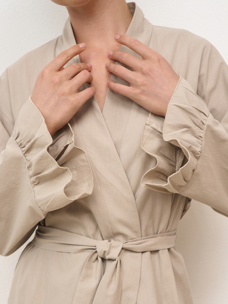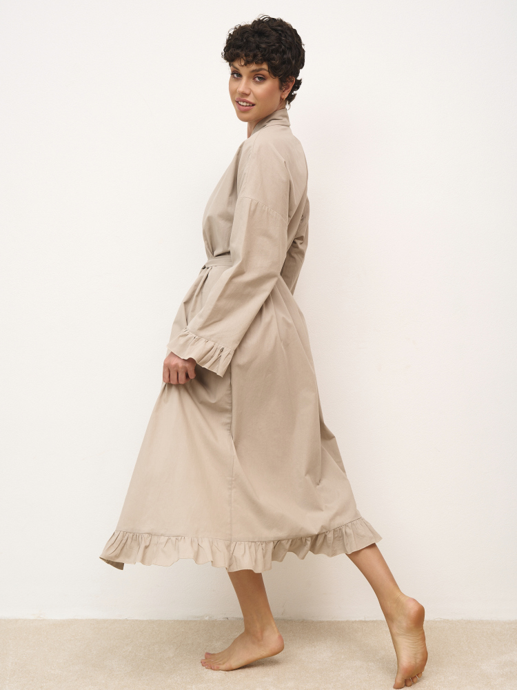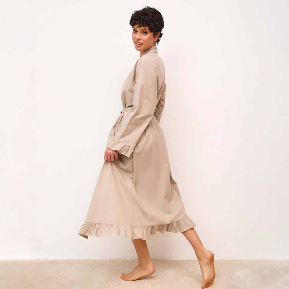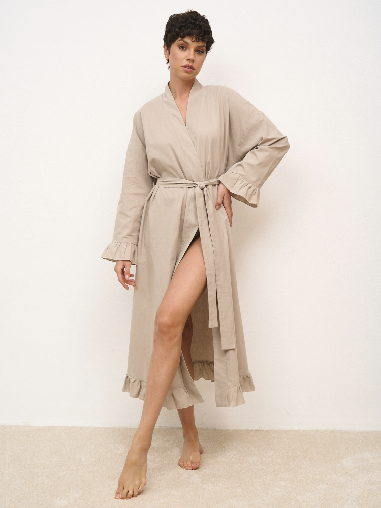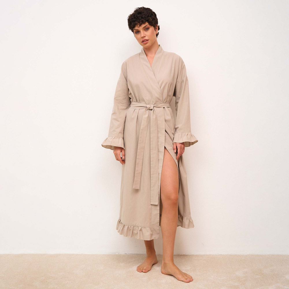 Халат-кимоно из вареного хлопка на запахе и длиной "макси", декорированный рюшами. В комплект входит пояс. Состав - 100% хлопок. Сделано в России.