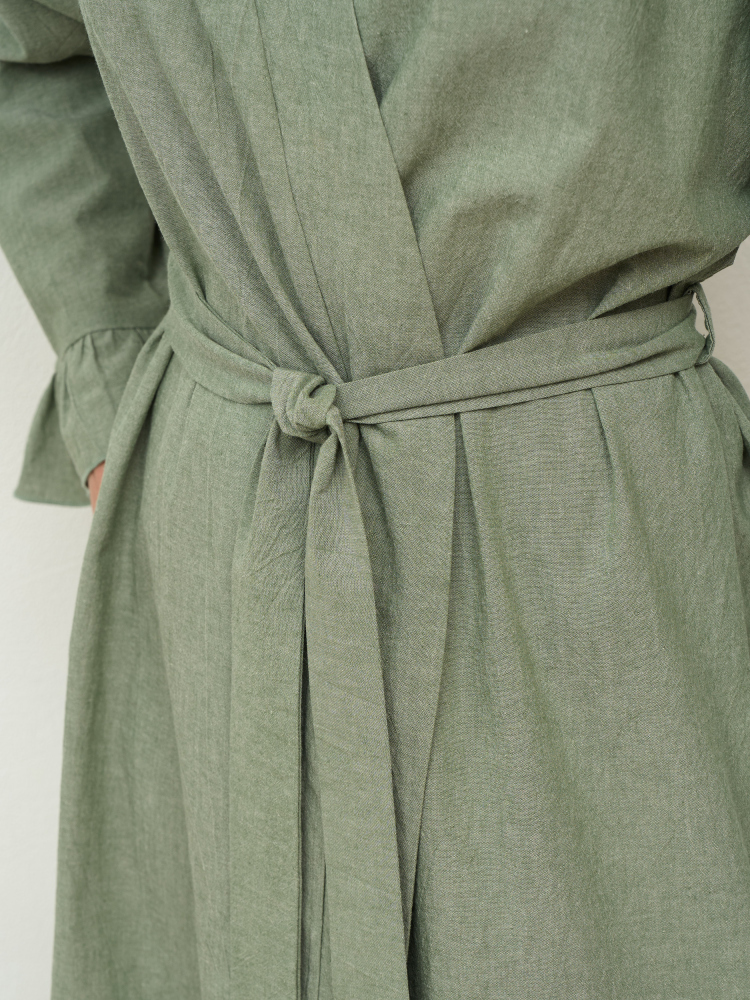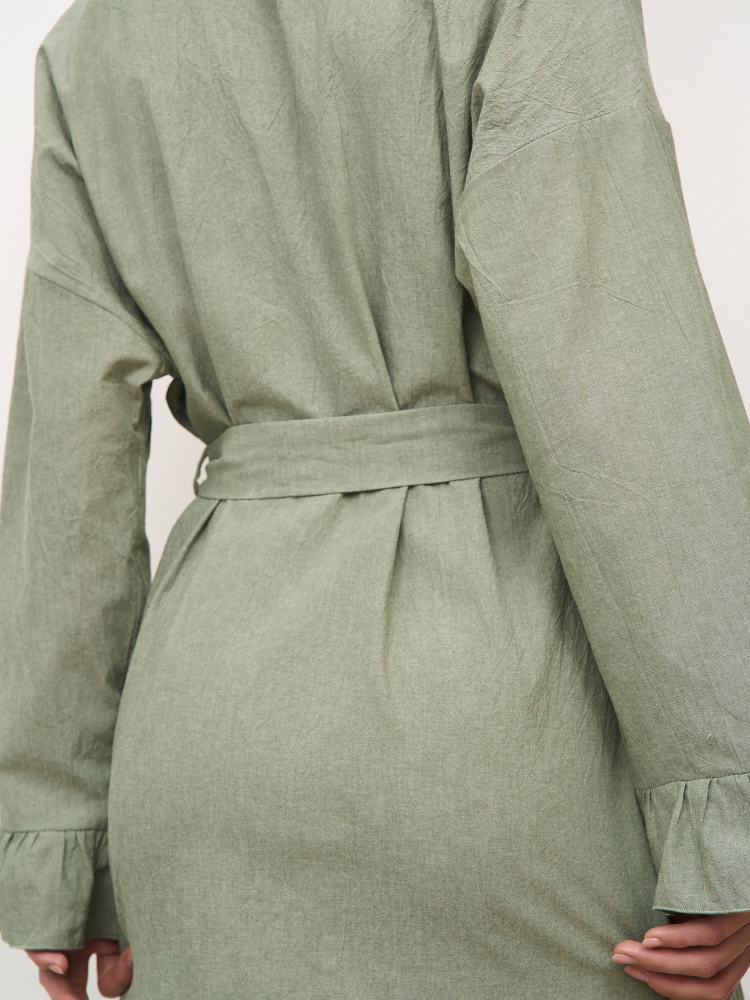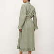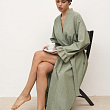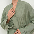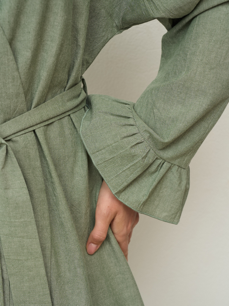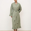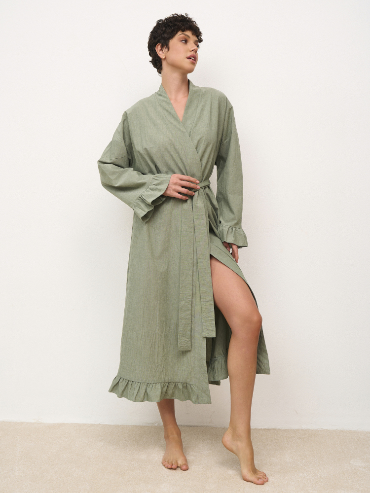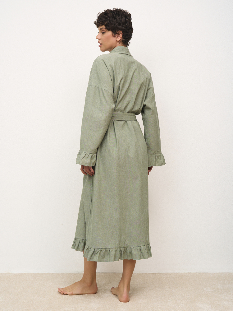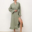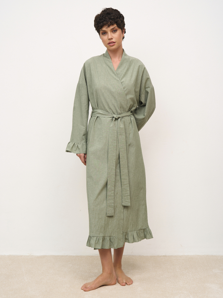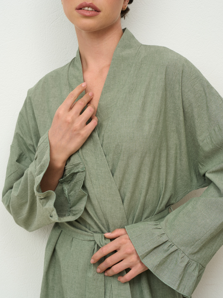Халат-кимоно из вареного хлопка на запахе и длиной "макси", декорированный рюшами. В комплект входит пояс. Состав - 100% хлопок. Сделано в России.