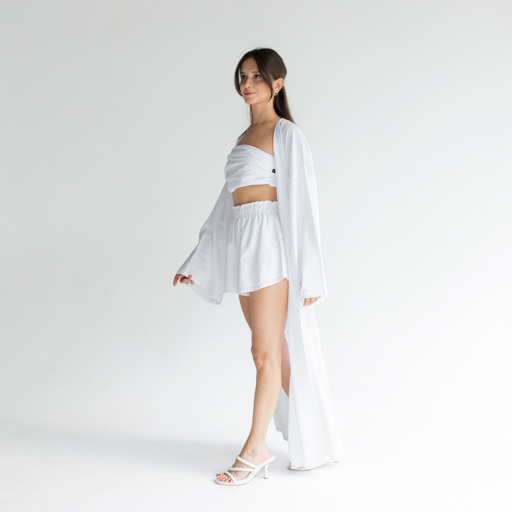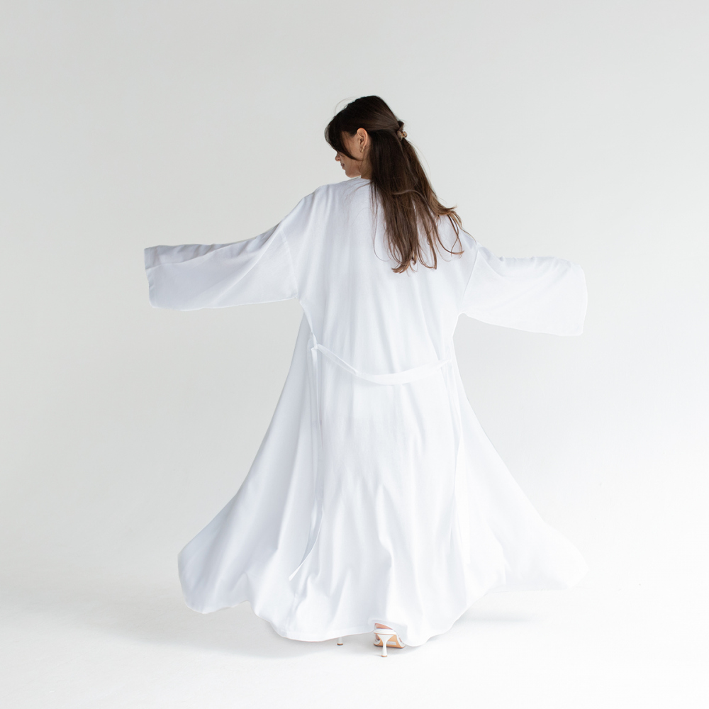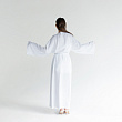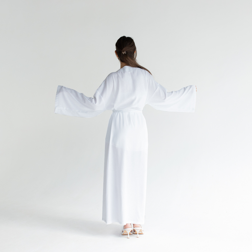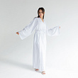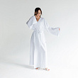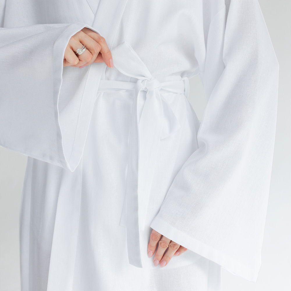 Халат-кимоно из льняной однотонной ткани на запахе и длиной "макси", пояс в комплекте. Состав 28% льна/49% вискоза/23% хлопок. Параметры модели - 165, 82/60/89. На модели - размер S/M. Сделано в России.