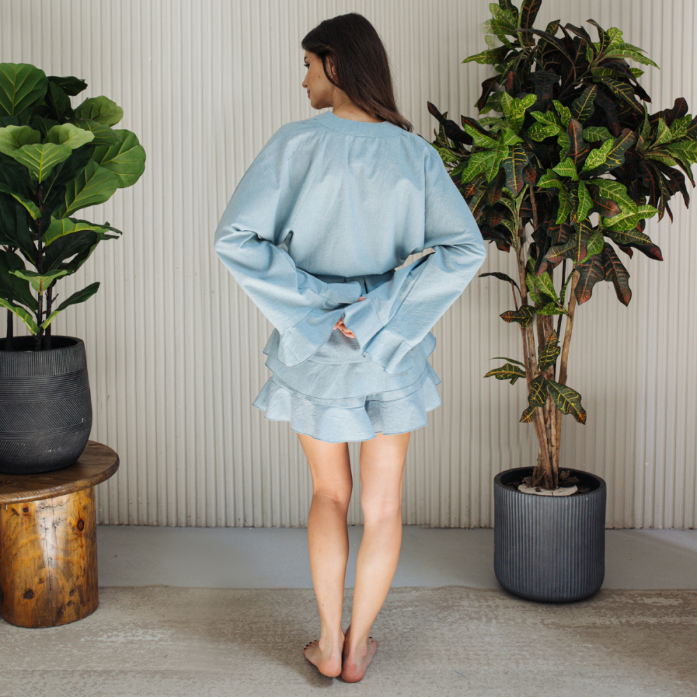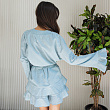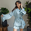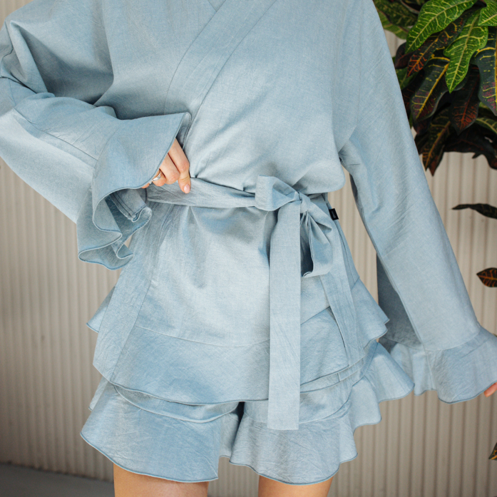 Рубашка-кимоно из из вареного хлопка на запахе с рюшами, пояс в комплекте. Состав - 100% Хлопок. Параметры модели - 165, 82/60/89. На модели - размер S/M. Сделано в России.