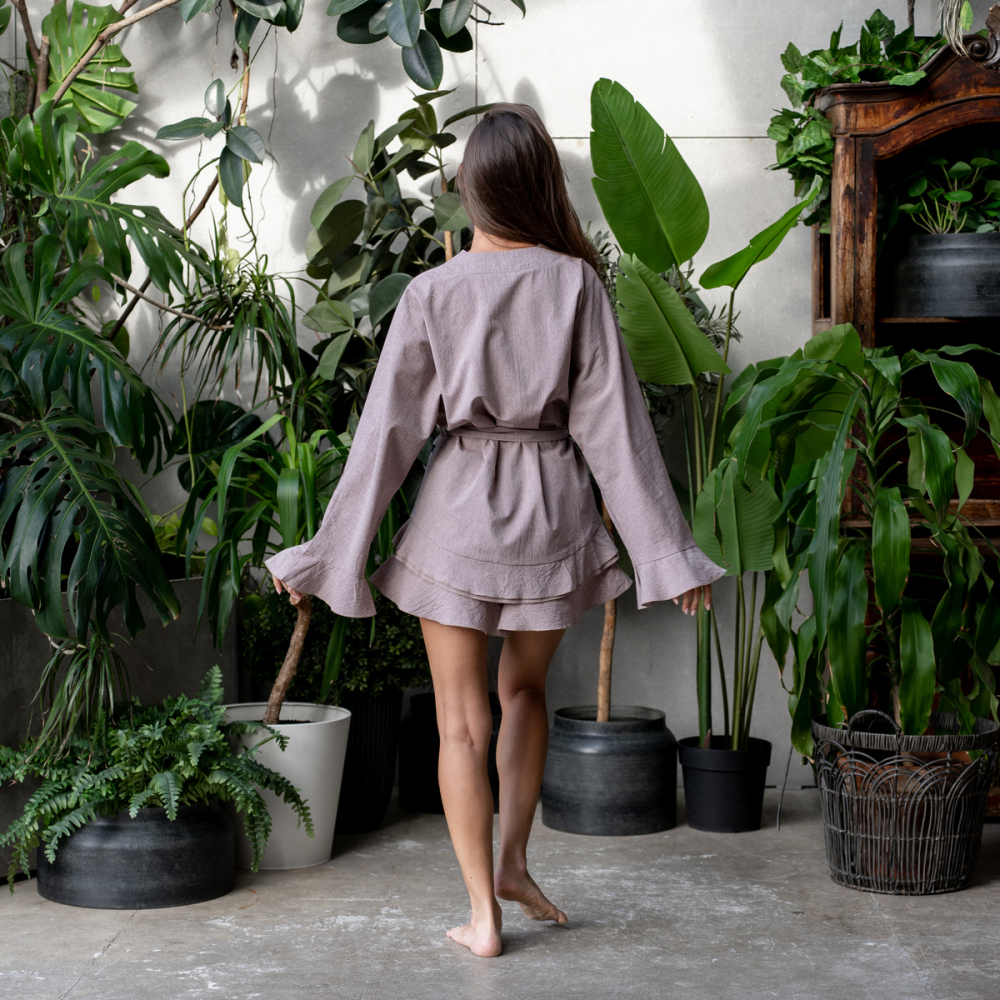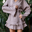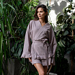 Рубашка-кимоно из из вареного хлопка на запахе с рюшами, пояс в комплекте. Состав - 100% Хлопок. Параметры модели - 165, 82/60/89. На модели - размер S/M. Сделано в России.