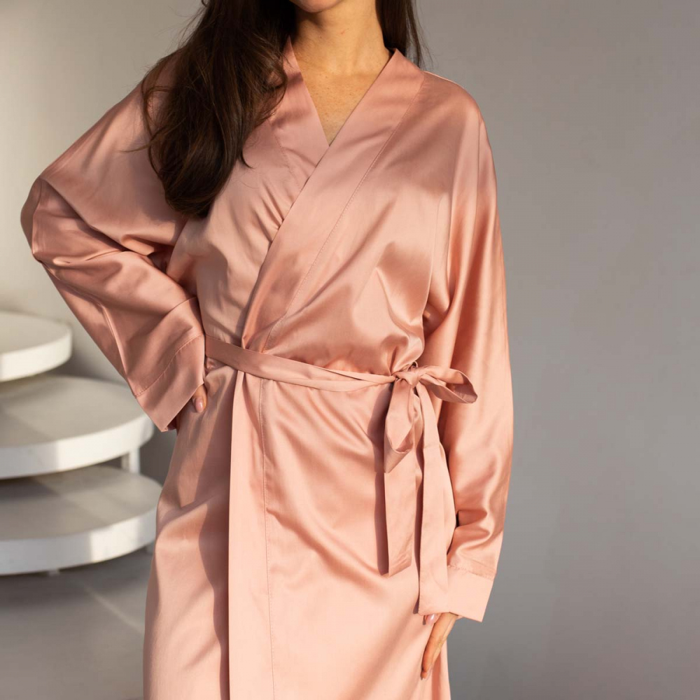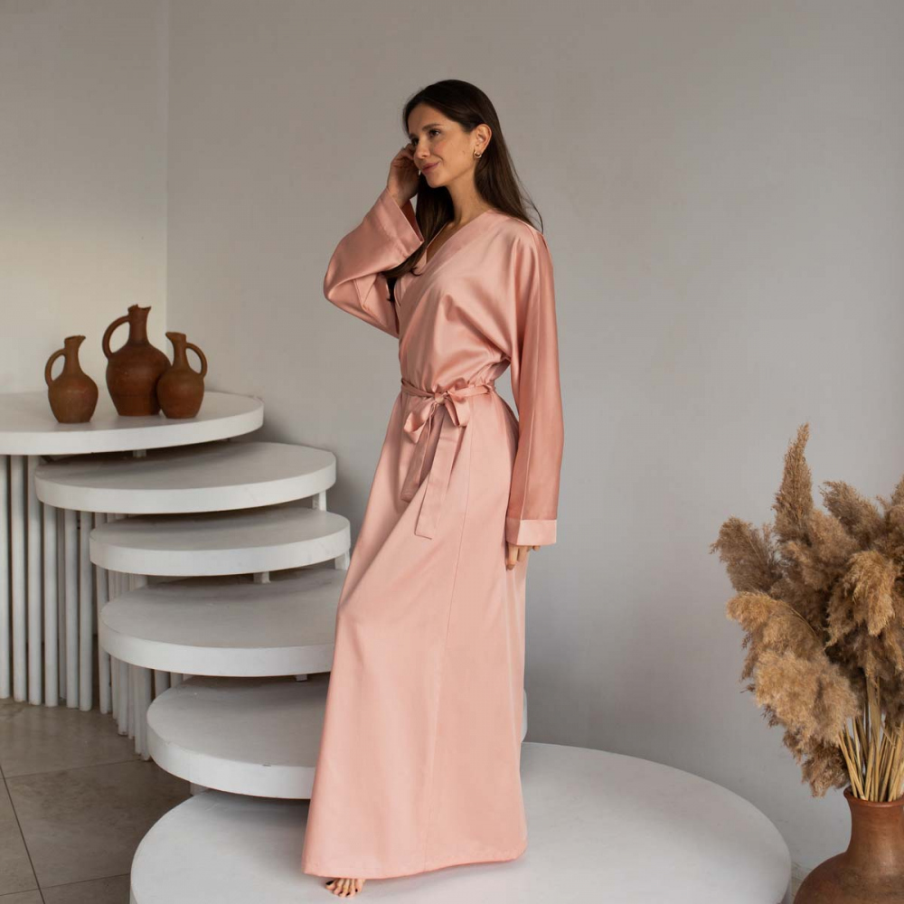 Халат-кимоно из тенселя на запахе и длиной "макси", пояс в комплекте. Состав - 60% тенсель / 40% хлопок. Параметры модели - 165, 82/60/89. На модели - размер S/M. Сделано в России.