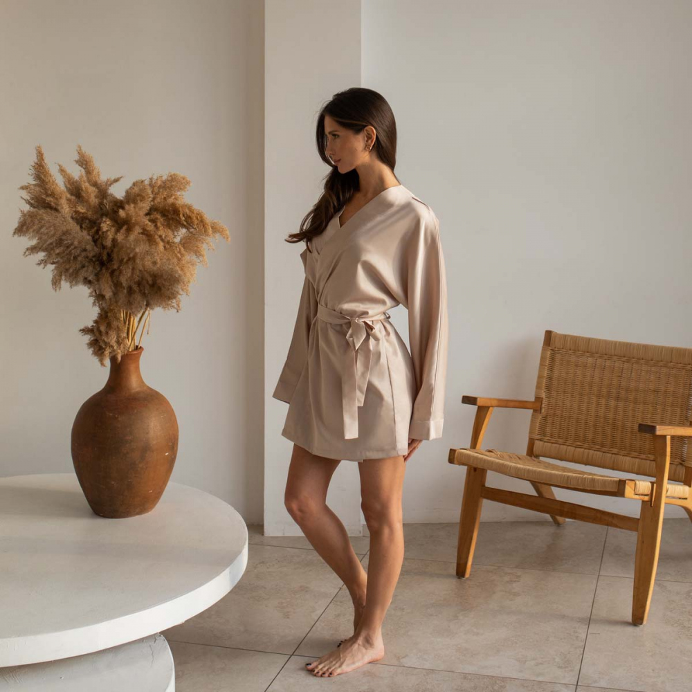 Халат-кимоно из тенселя на запахе и длиной "мини", пояс в комплекте. Состав - 60% тенсель / 40% хлопок. Параметры модели - 165, 82/60/89. На модели - размер S/M. Сделано в России.