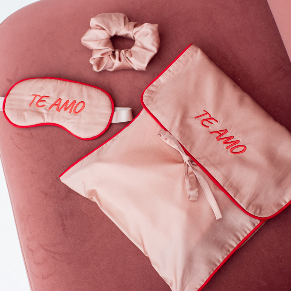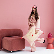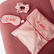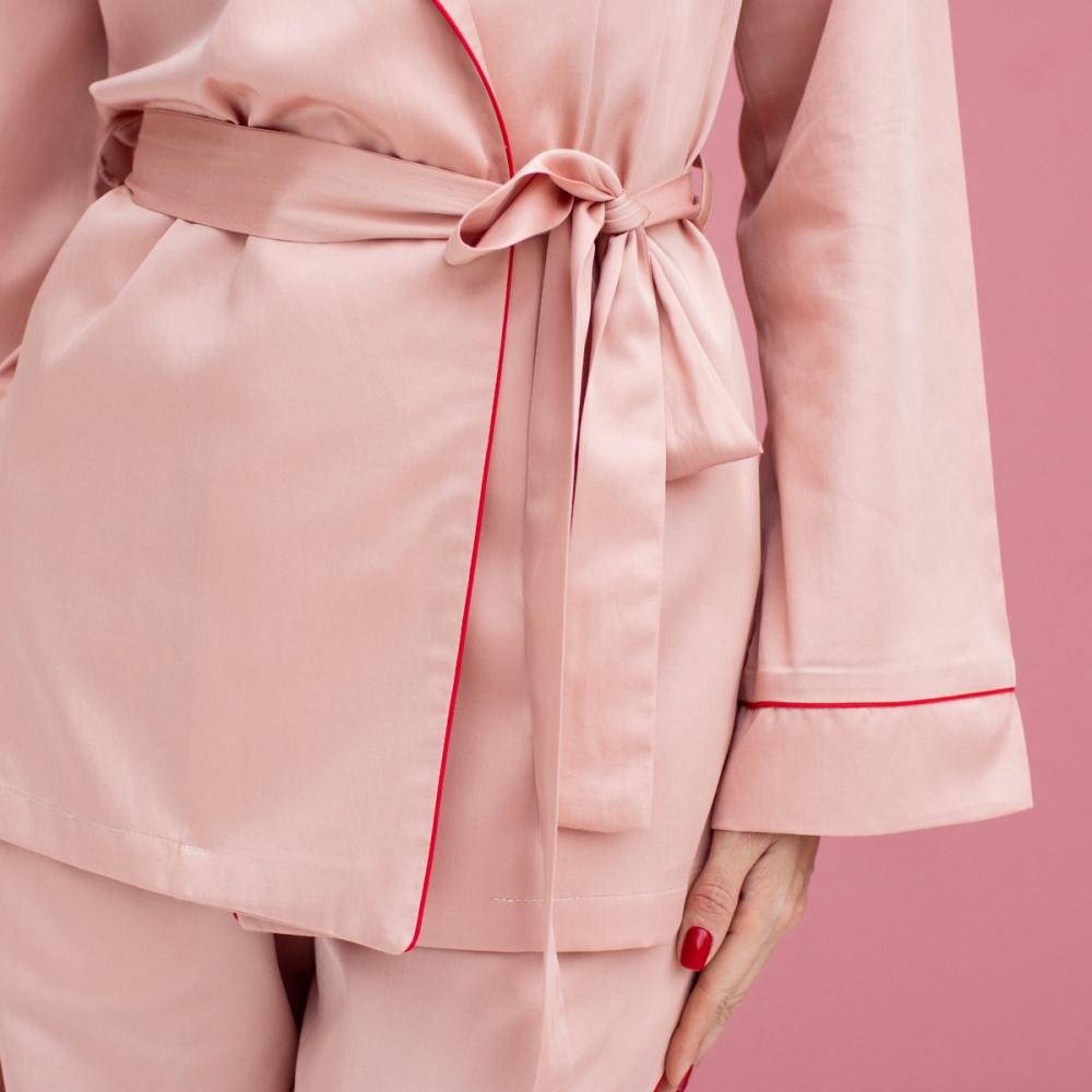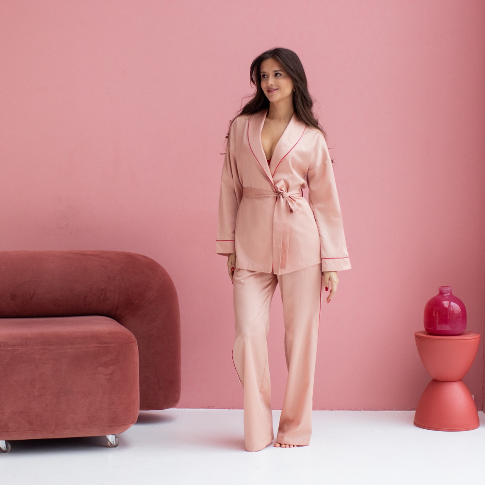 Подарочныq комплект из тенселя. Состав комплекта: кимоно, брюки пярмого кроя на резинке, маска и резинка для волос, упакованных в красивый конверт с вышивкой в нежно - пудровом цвете с алым кантом. Состав - 60% тенсель / 40% хлопок. Параметры модели - 165, 82/60/89. На модели - размер XS. Сделано в России.