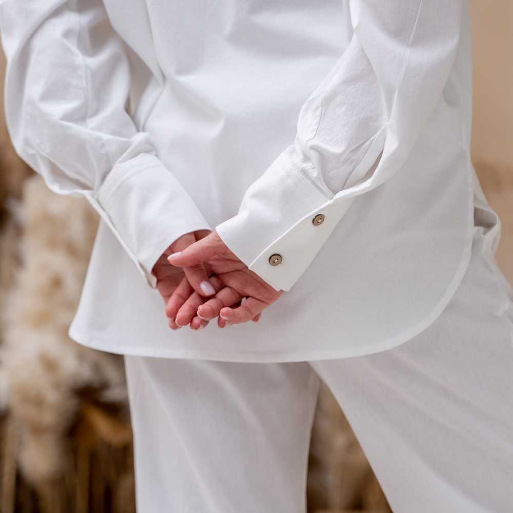 Рубашка из вареного хлопка, декорированная контрастными пуговицами. Состав - 100% Хлопок. Параметры модели - 172, 87/62/92. На модели - размер S/M. Сделано в России.