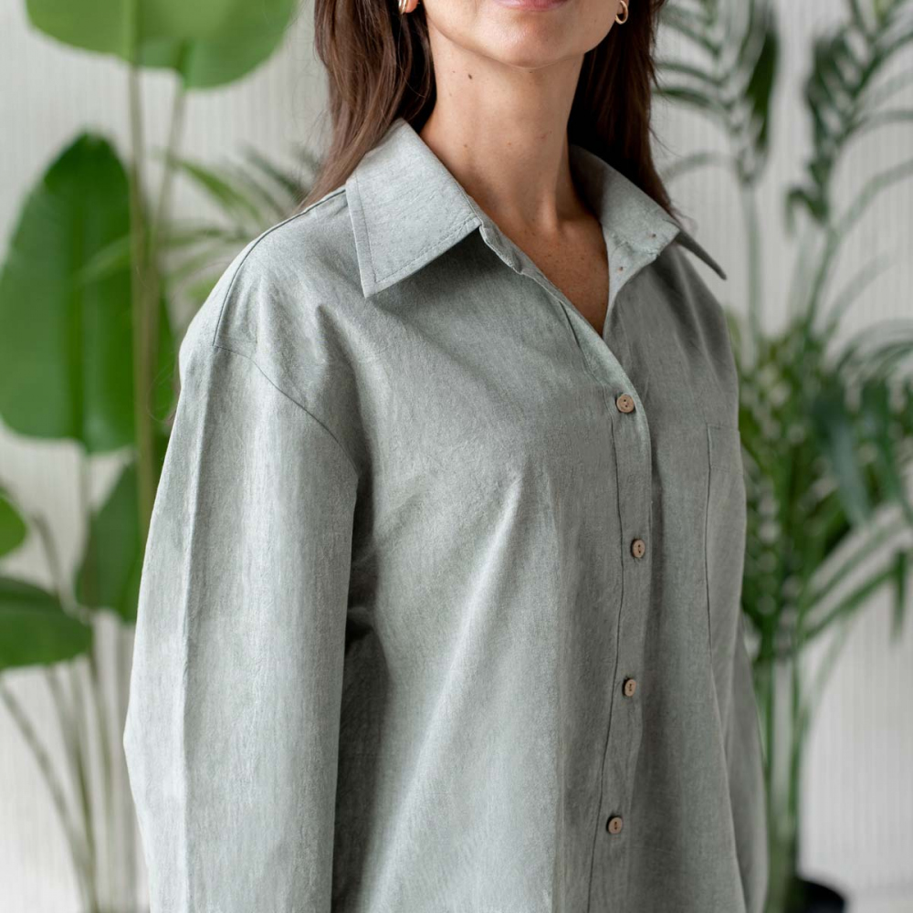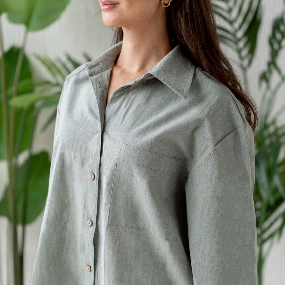 Рубашка из вареного хлопка, декорированная контрастными пуговицами. Состав - 100% Хлопок. Параметры модели - 172, 87/62/92. На модели - размер S/M. Сделано в России.