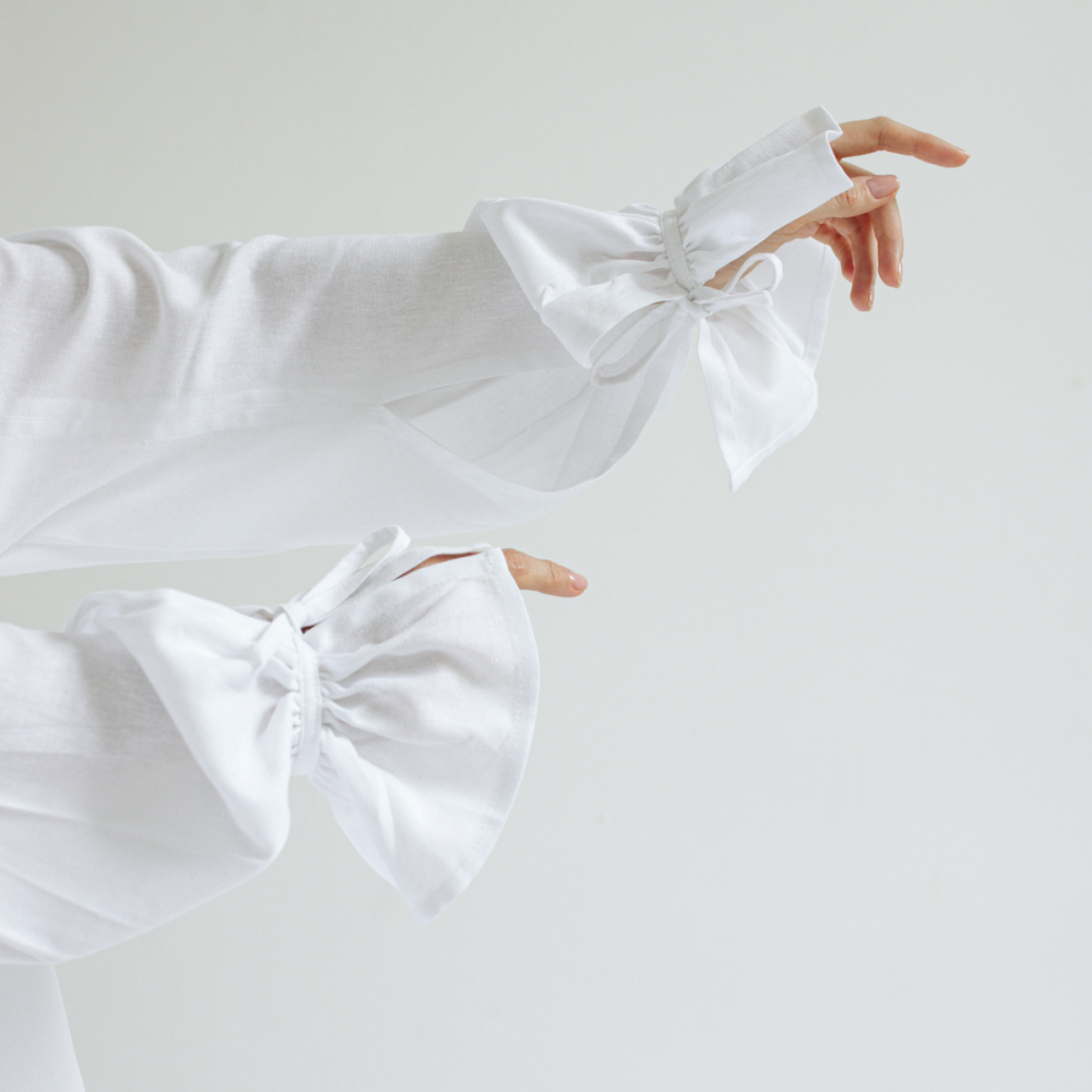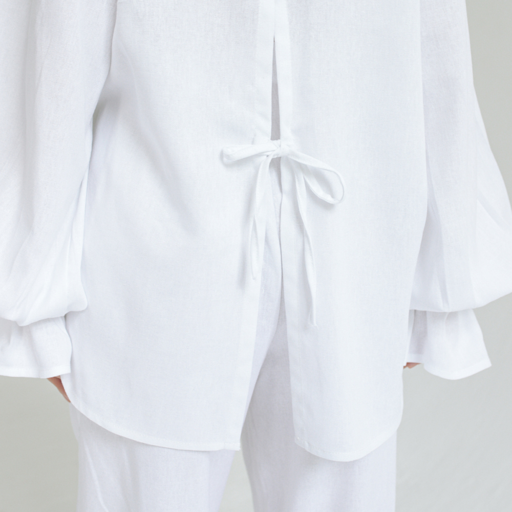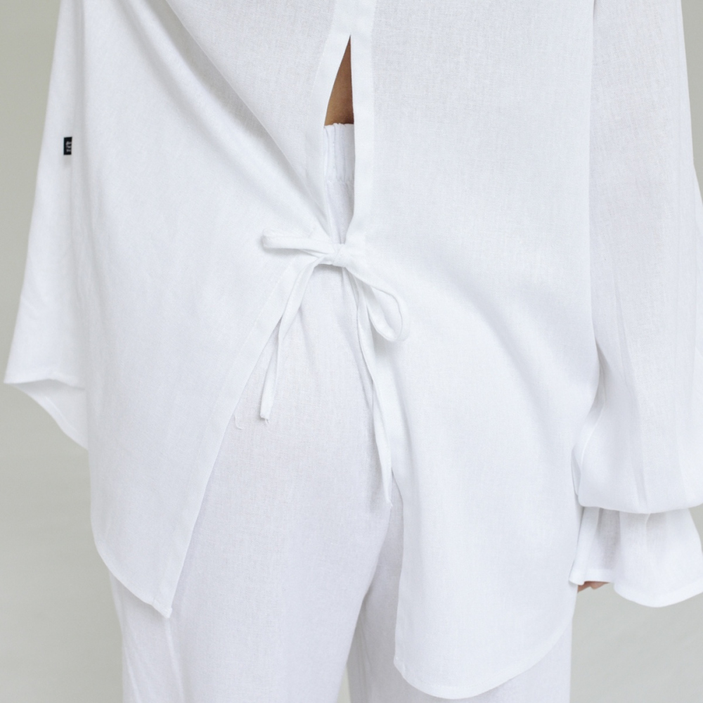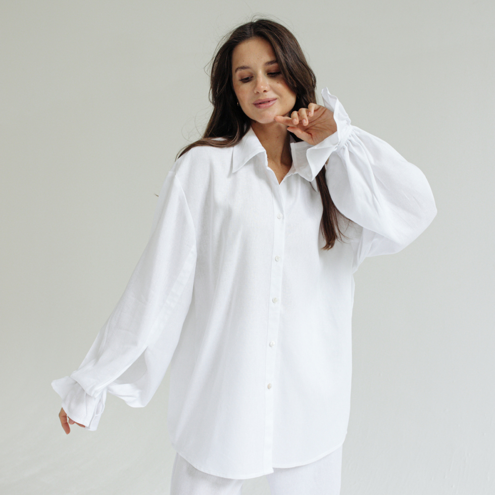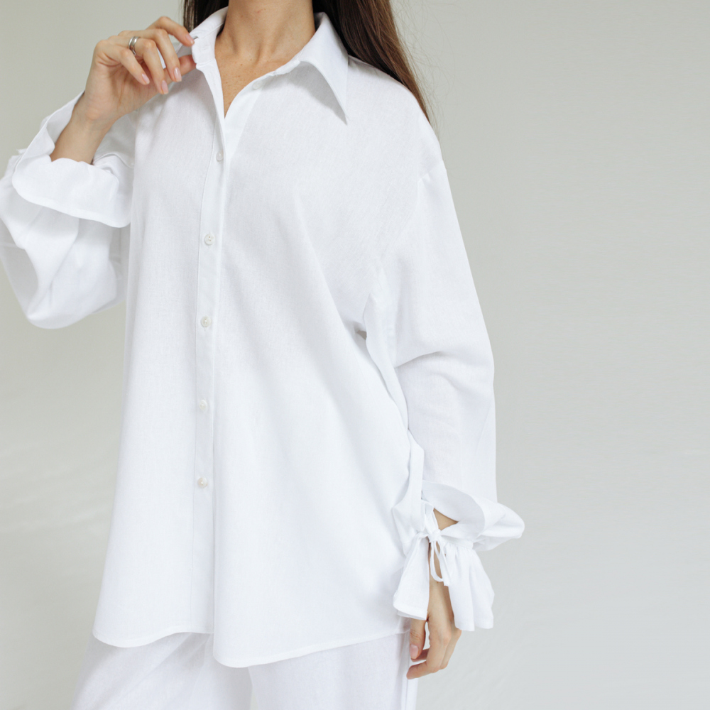 Рубашка из льняной однотонной ткани. Состав 28% льна/49% вискоза/23% хлопок. Параметры модели - 165, 82/60/89. На модели - размер S/M. Сделано в России.