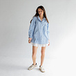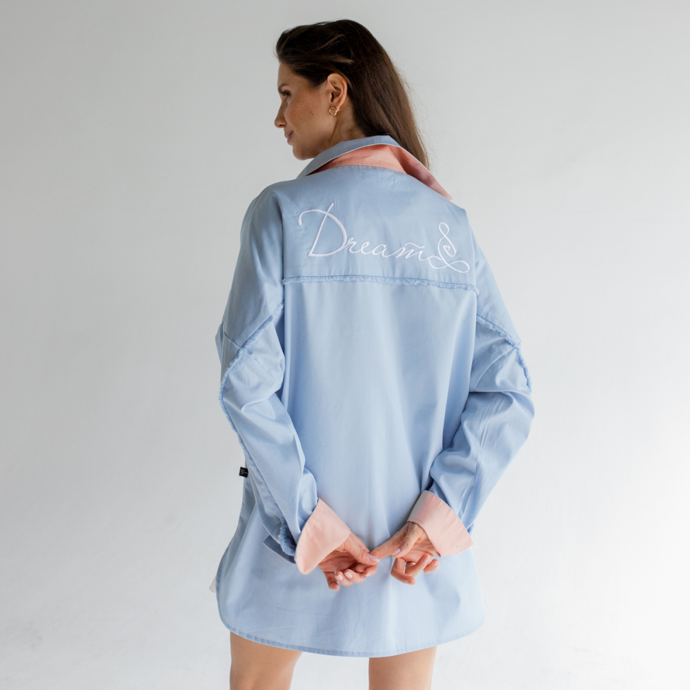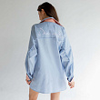 Рубашка из сатина, декорированная вышивкой и бахромой. Манжеты и ворот выполнены из контрастной ткани. Состав - 100% Хлопок. Параметры модели - 172, 87/62/92. На модели - размер S/M. Сделано в России.