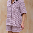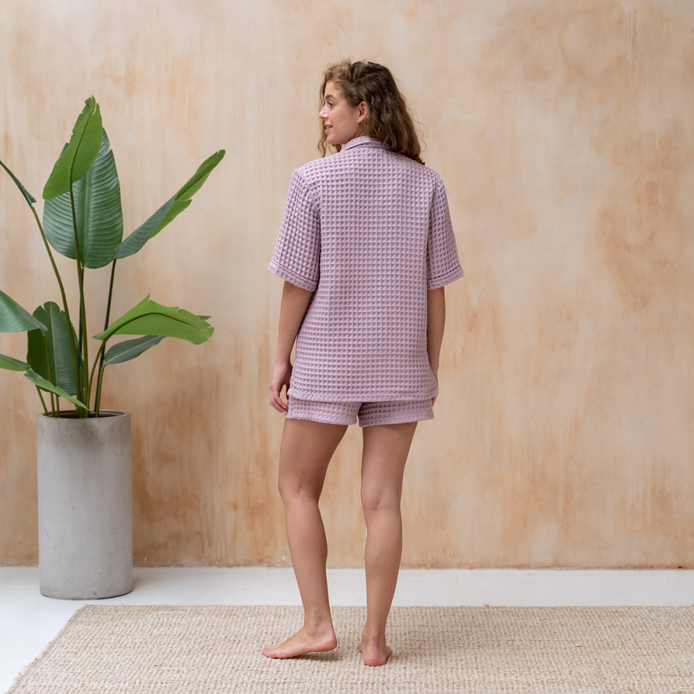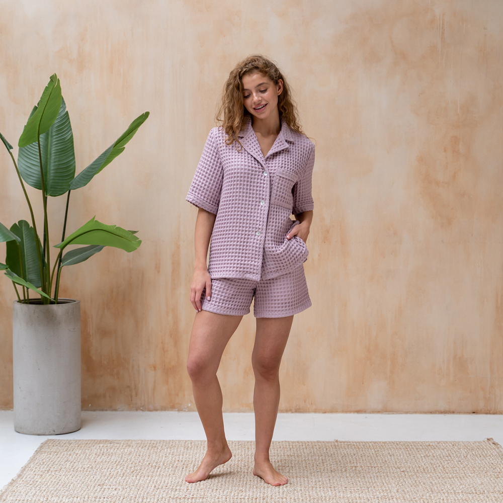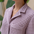Рубашка с коротким рукавом из вафельного полотна, декорированная контрастными пуговицами и накладным карманом. Состав - 100% хлопок. Параметры модели - 172, 87/62/92. На модели - размер S/M. Сделано в России.