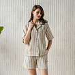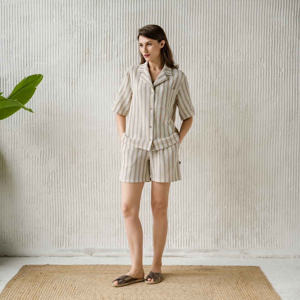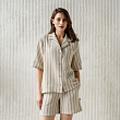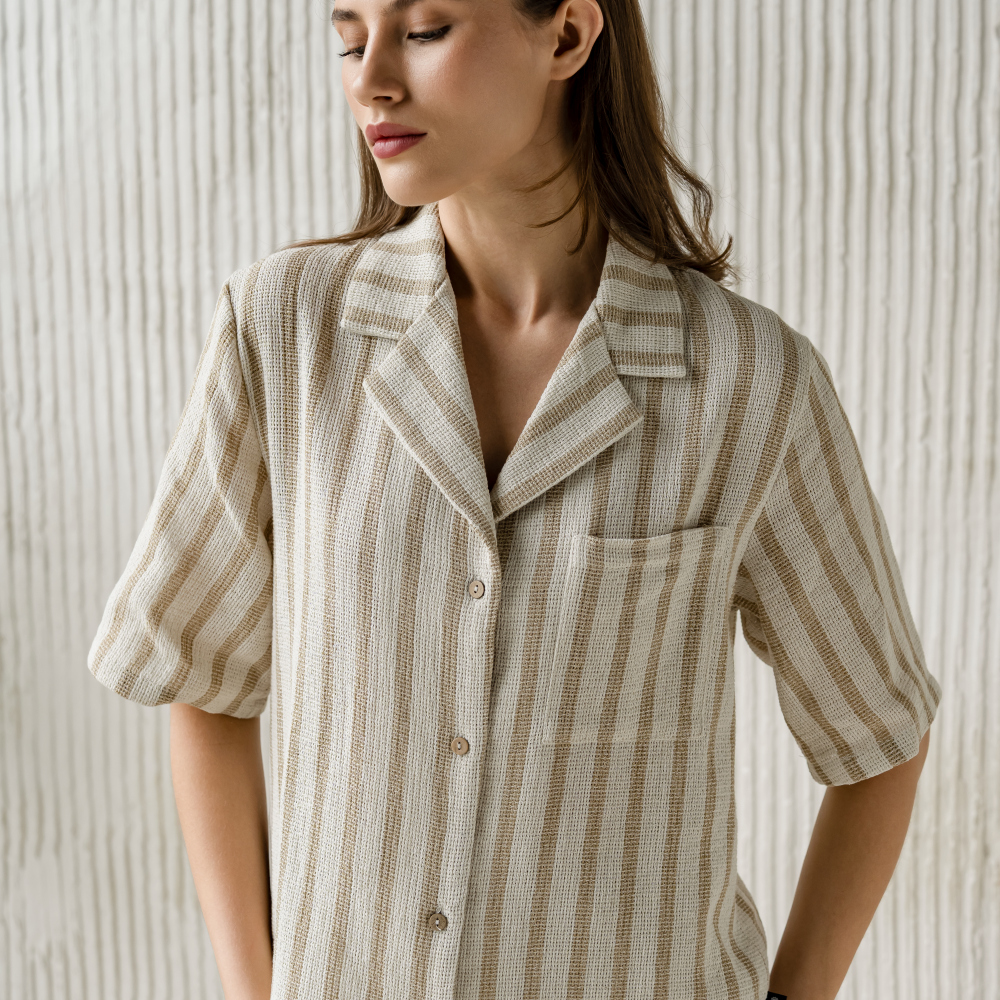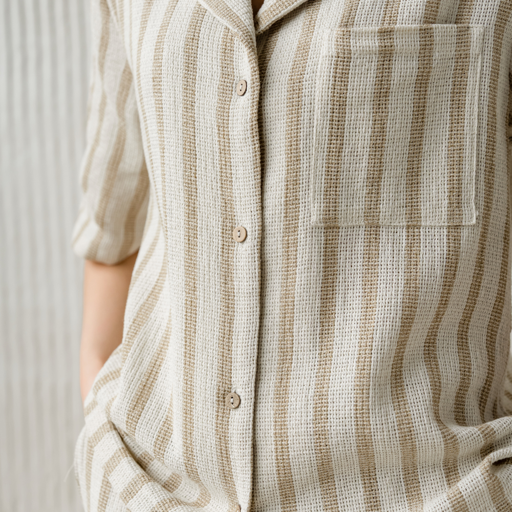 Рубашка с коротким рукавом из фактурного хлопка на пуговицах. Состав 70% хлопок/30% ПЭ. Сделано в России.