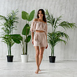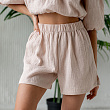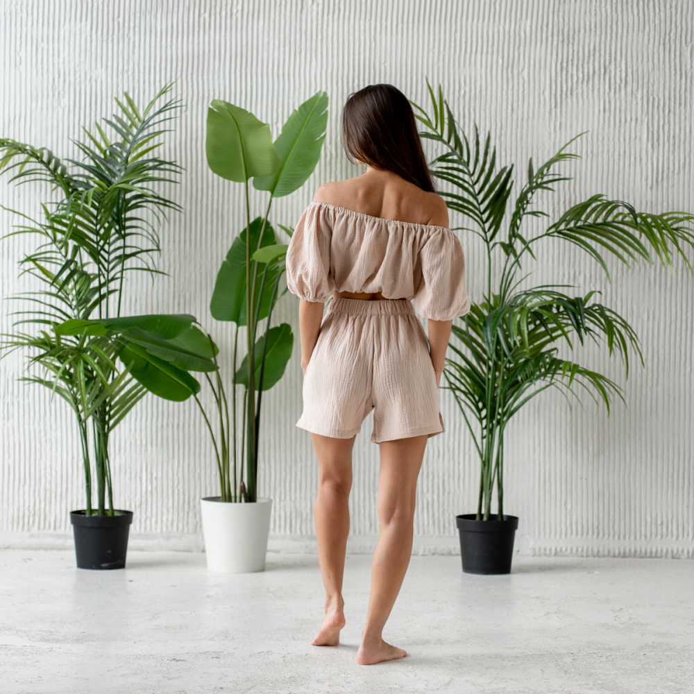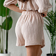 Шорты из муслина на резинке, с разрезами по бокам. Состав - 100% Хлопок. Параметры модели - 172, 87/62/92. На модели - размер S/M. Сделано в России.