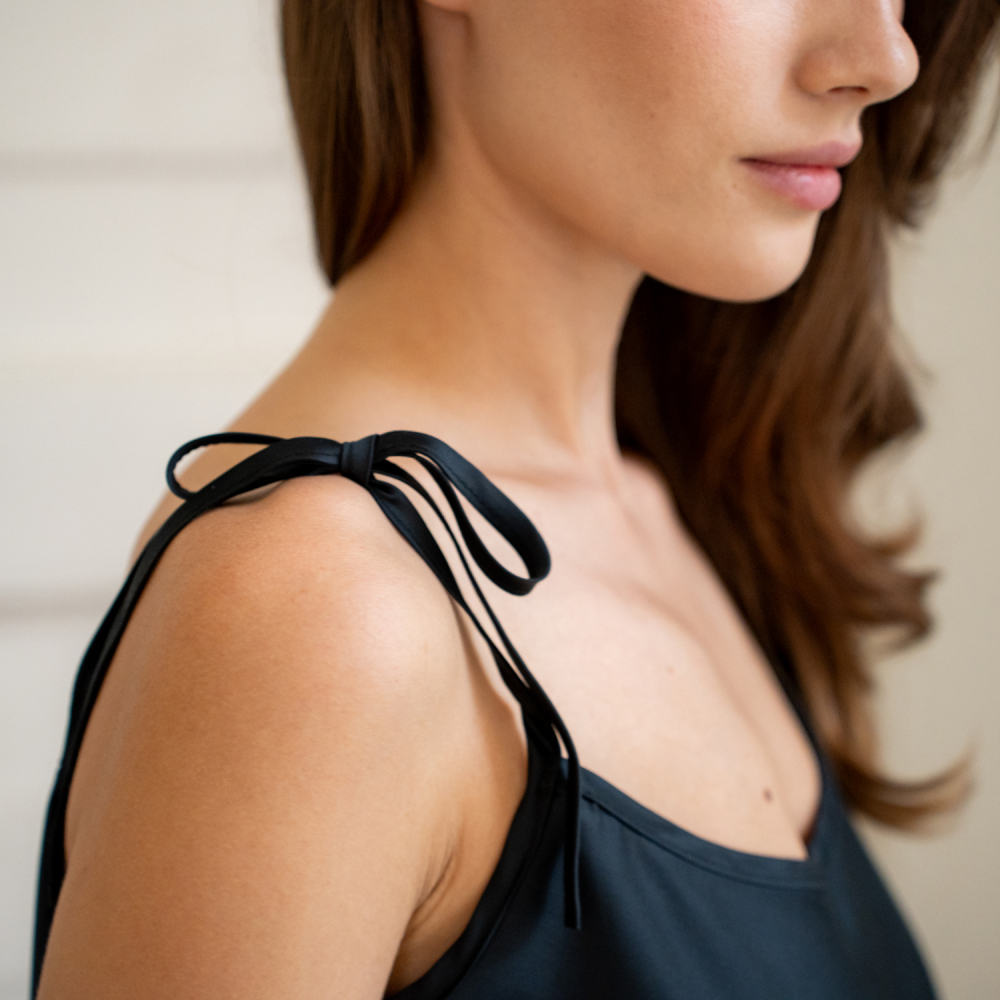 Топ на завязках из тенселя. Состав 60% тенсель/ 40% хлопок. На модели - размер S/M. Сделано в России.