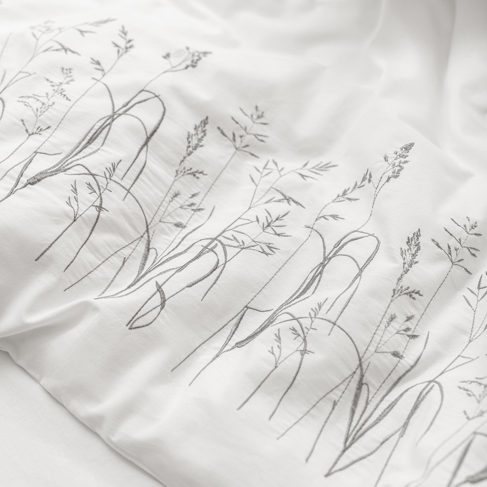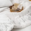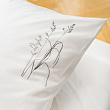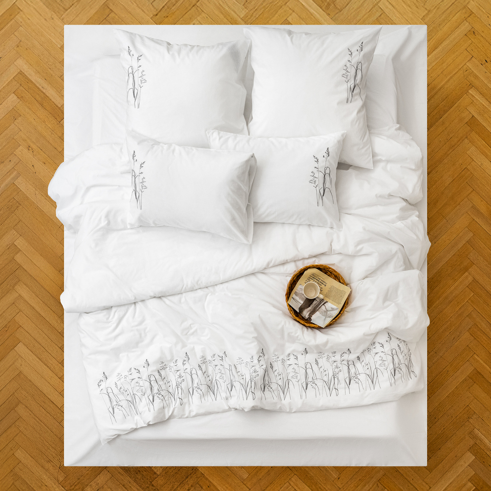 Комплект постельного белья из вареного хлопка с контрастной вышивкой. В комплект входят 2 наволочки, пододеяльник, простынь и чехол для хранения. Состав - 100% Хлопок.