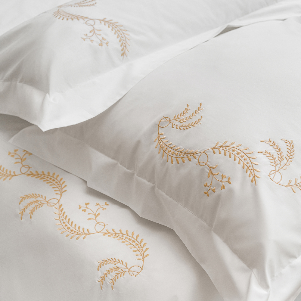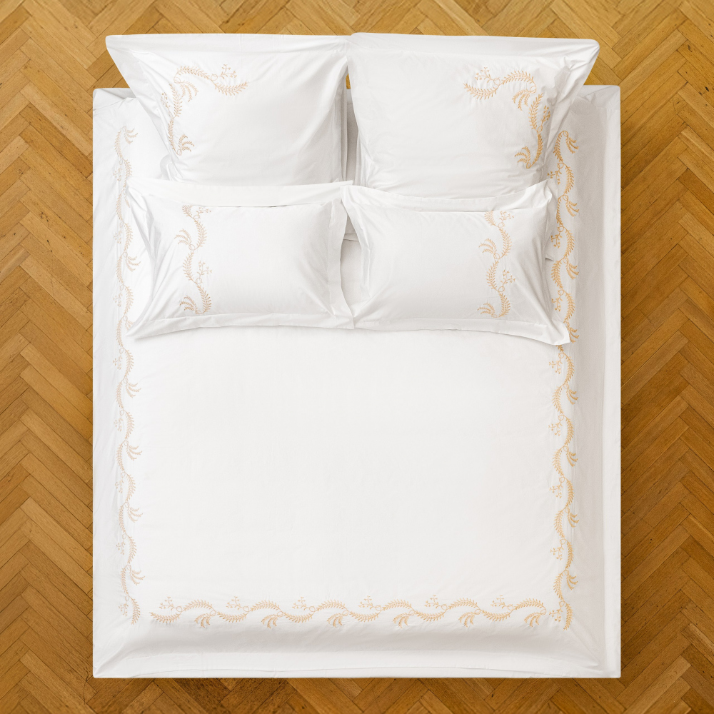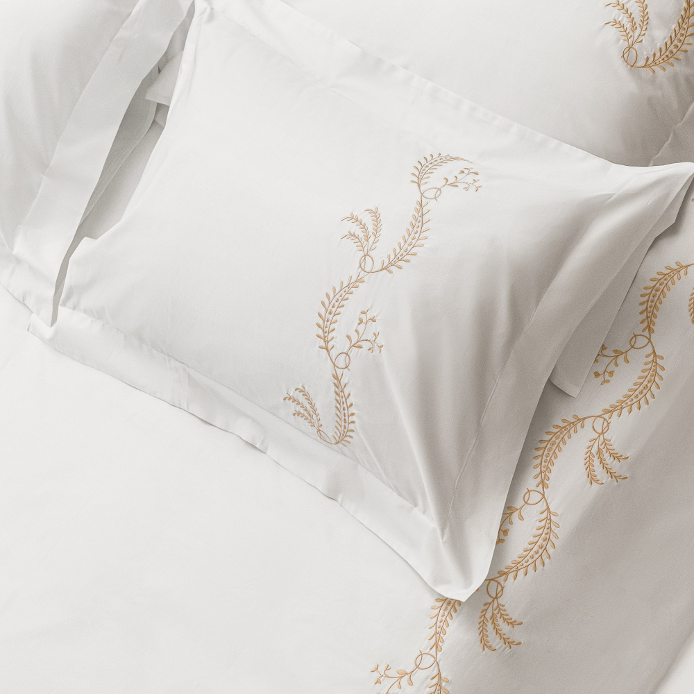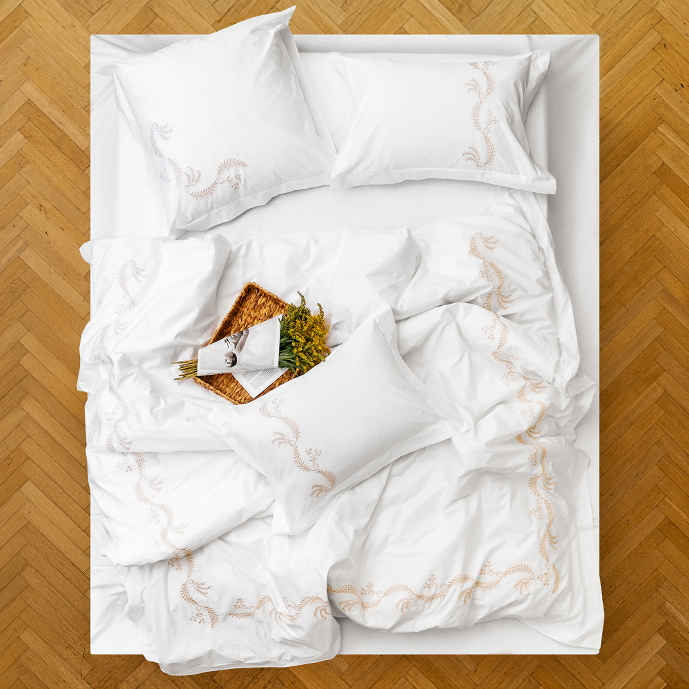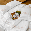 Комплект постельного белья из сатина с контрастной вышивкой. В комплект входят 2 наволочки, пододеяльник, простынь и чехол для хранения. Состав - 100% Хлопок.