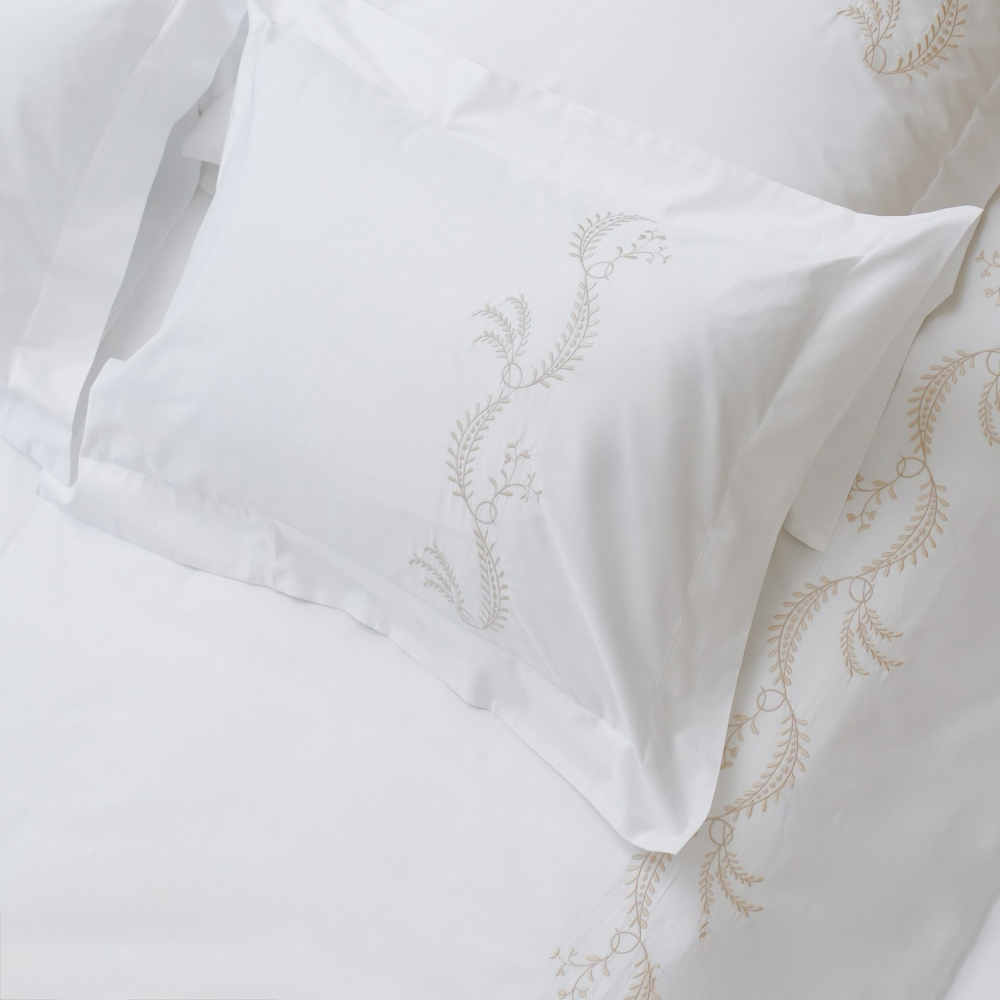 Комплект постельного белья из сатина с контрастной вышивкой. В комплект входят 2 наволочки, пододеяльник, простынь и чехол для хранения.  Со...