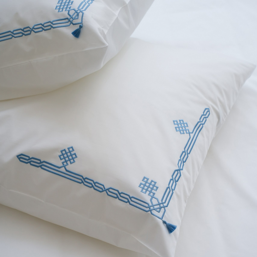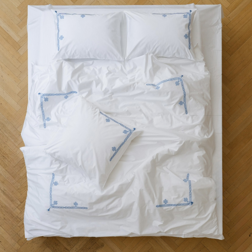 Комплект постельного белья из вареного хлопка с контрастной вышивкой. В комплект входят 2 наволочки, пододеяльник, простынь и чехол для хранения. ...