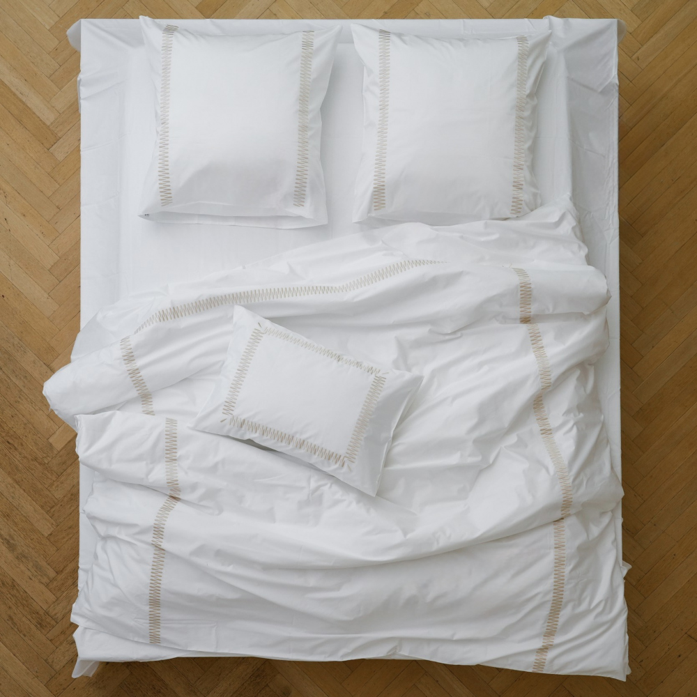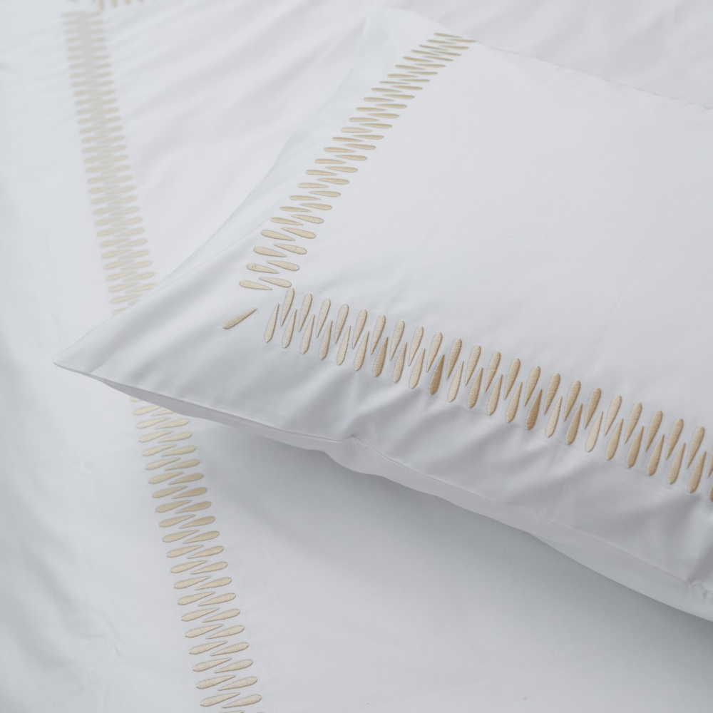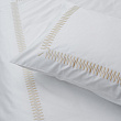 Комплект постельного белья из сатина с контрастной вышивкой. В комплект входят 2 наволочки, пододеяльник, простынь и чехол для хранения. Состав - 100% Хлопок.