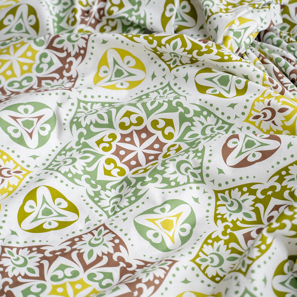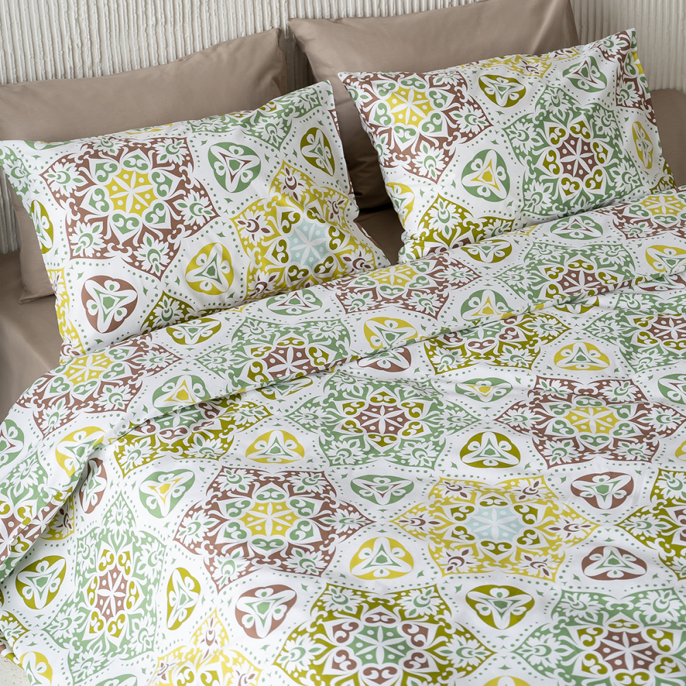Копплект постельного белья из натуральной ткани с восточным принтом. В комплект входят 2 наволочки с клапаном. Материал ткани - ранфорс, состав - 100% хлопок, плотность ткани - 115 г/м2.