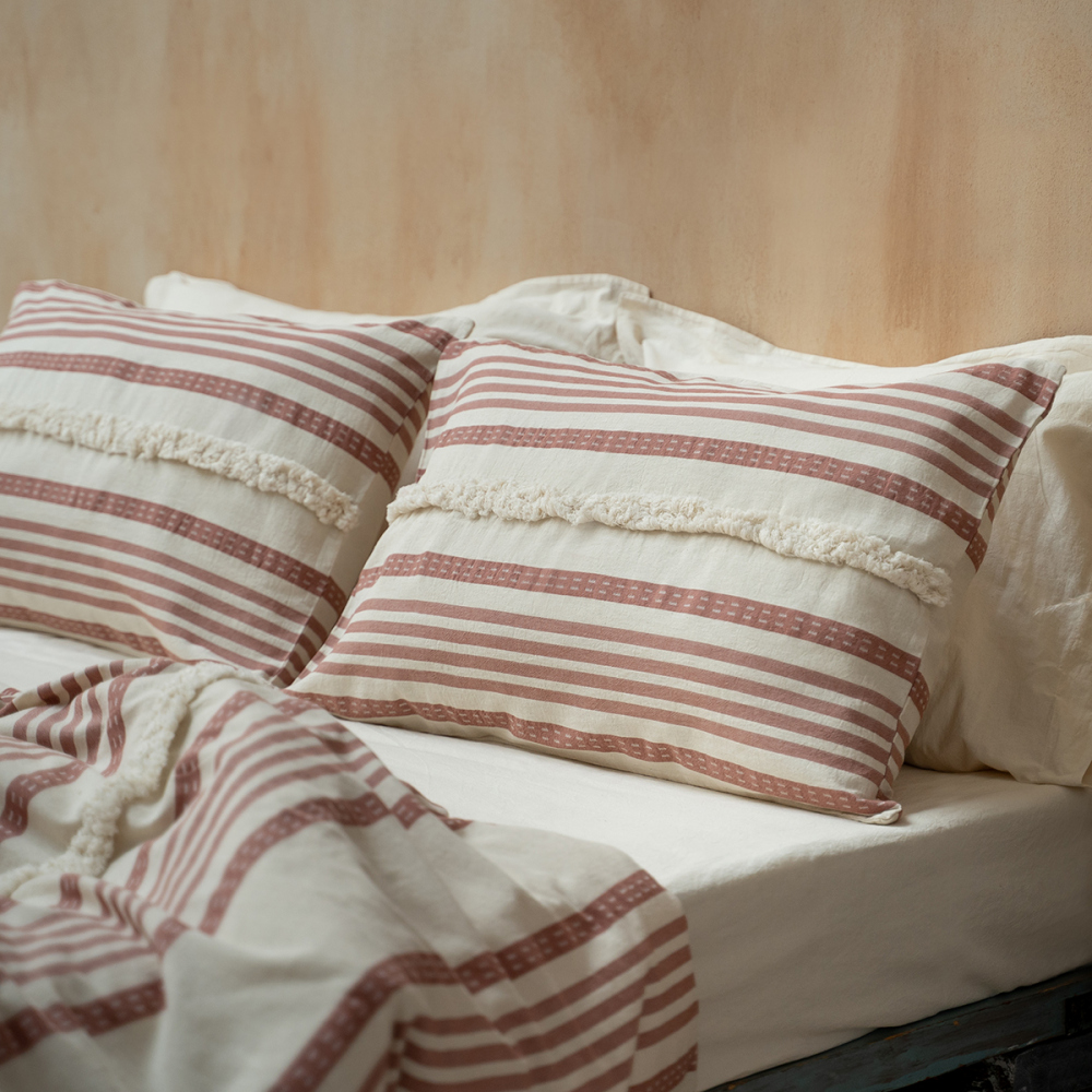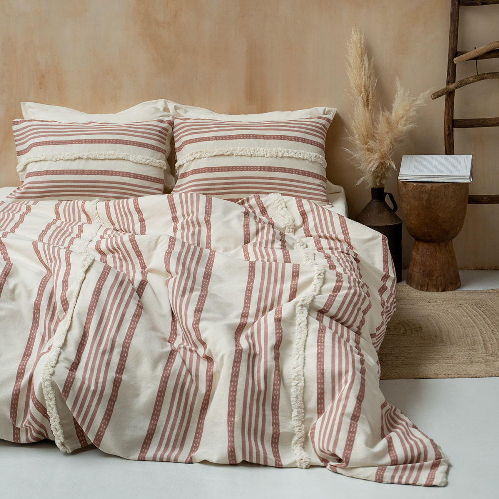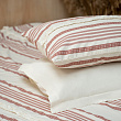 Комплект постельного белья из натуральной ткани с декоративными элементами. В комплект входят 4 наволочки на молнии, пододеяльник на молнии, простыня. Материал-ранфорс, состав - 100% хлопок. Плотность ткани - 115 г/м2.